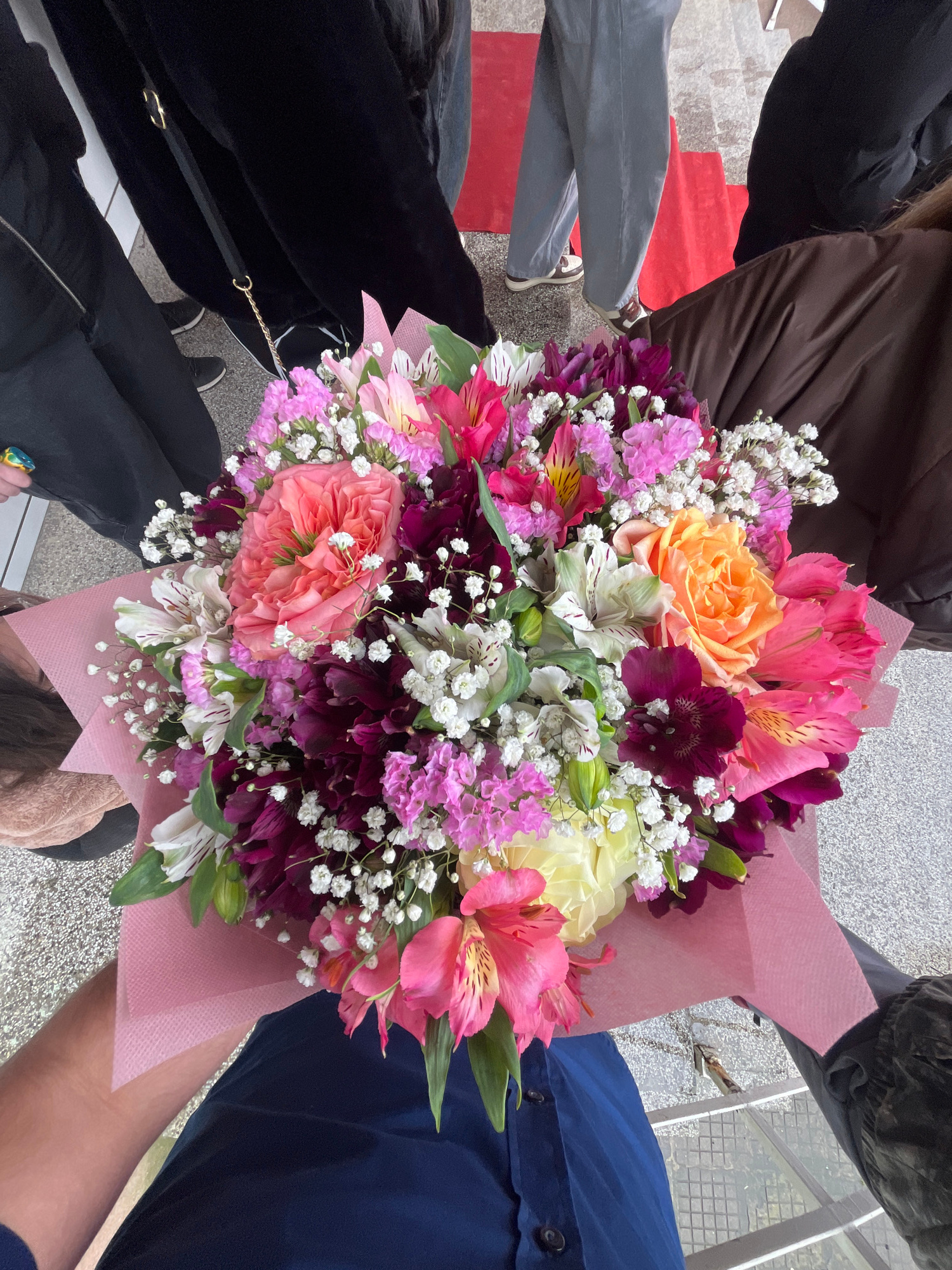 The image shows a bouquet of flowers held by a person in a blue shirt. The bouquet contains orange roses, pink alstroemeria, purple and white lisianthus, and baby's breath. People surround the bouquet…read more