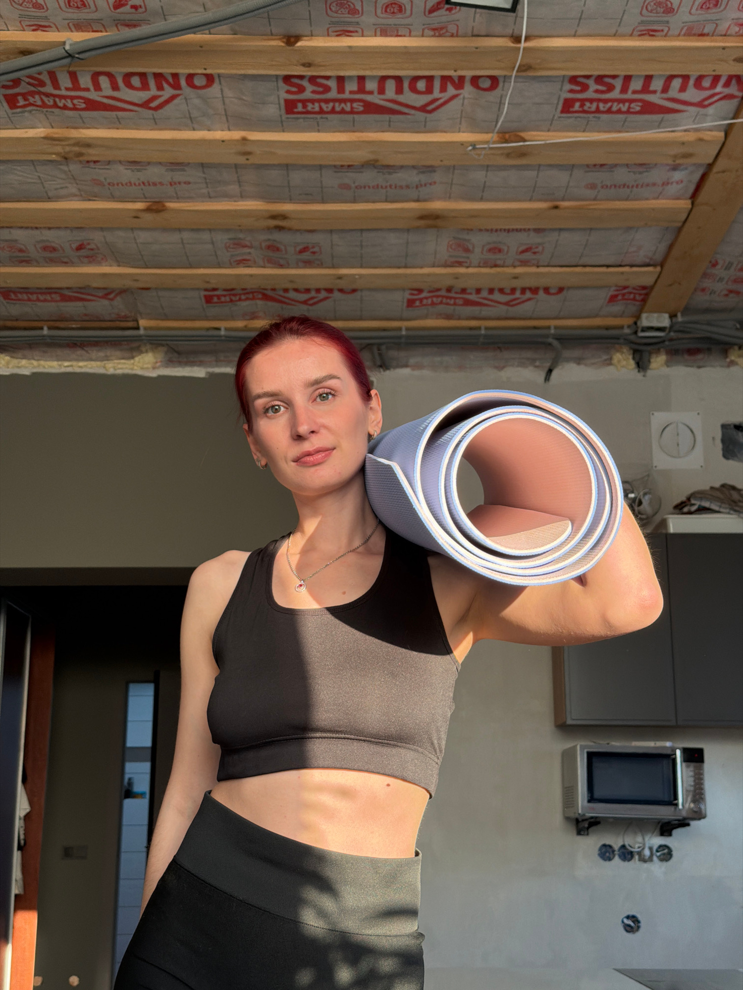 The image, correctly oriented, depicts a woman standing indoors, holding a rolled-up yoga mat. She has red hair, light-colored eyes, and a fair complexion, looking directly at the camera with a neutra…read more