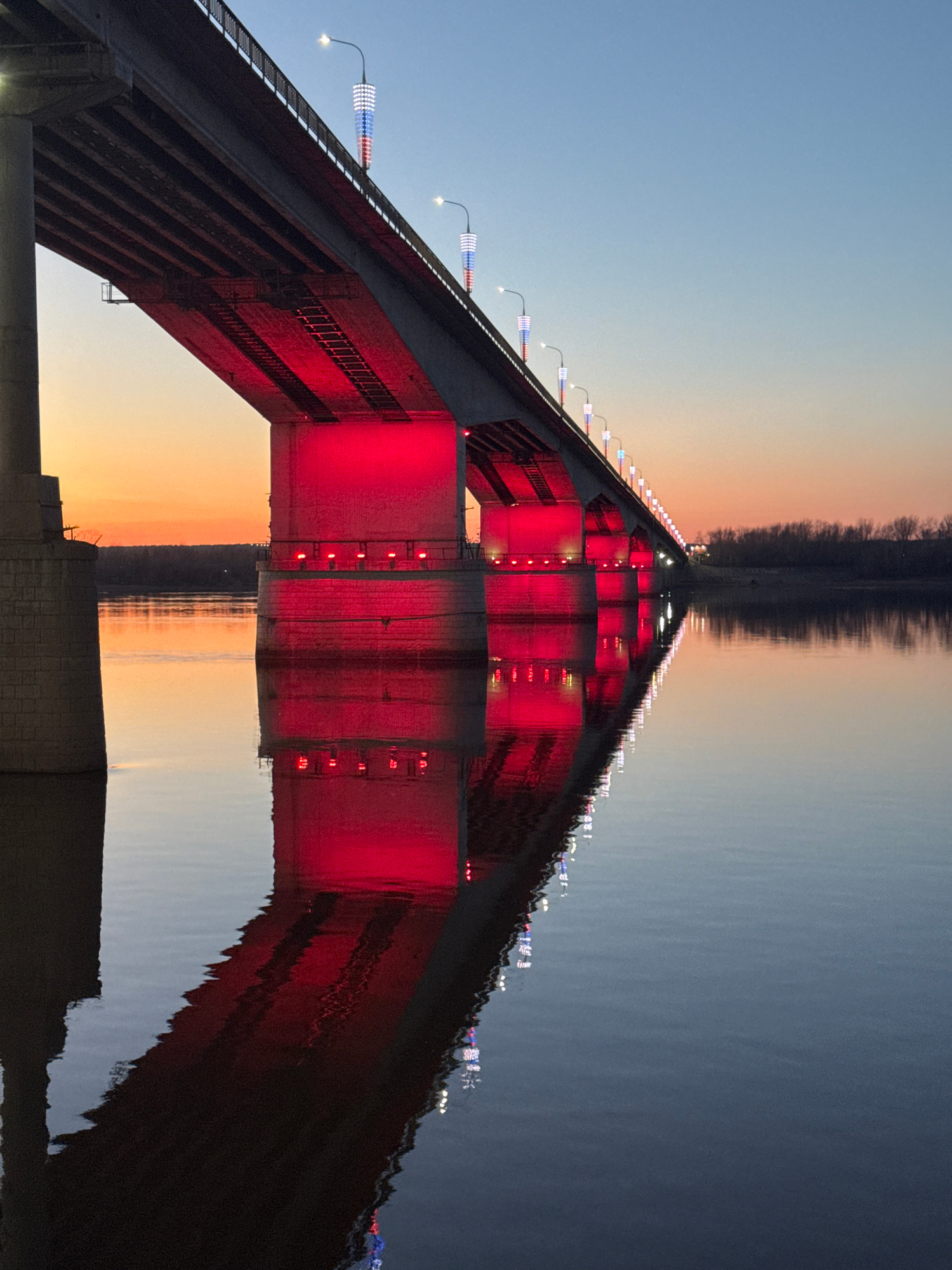 The image shows a bridge, likely the Kama Bridge in Perm, Russia, reflected in water. The bridge is illuminated with red lights, and the streetlights on the bridge have a red, white, and blue design.…read more