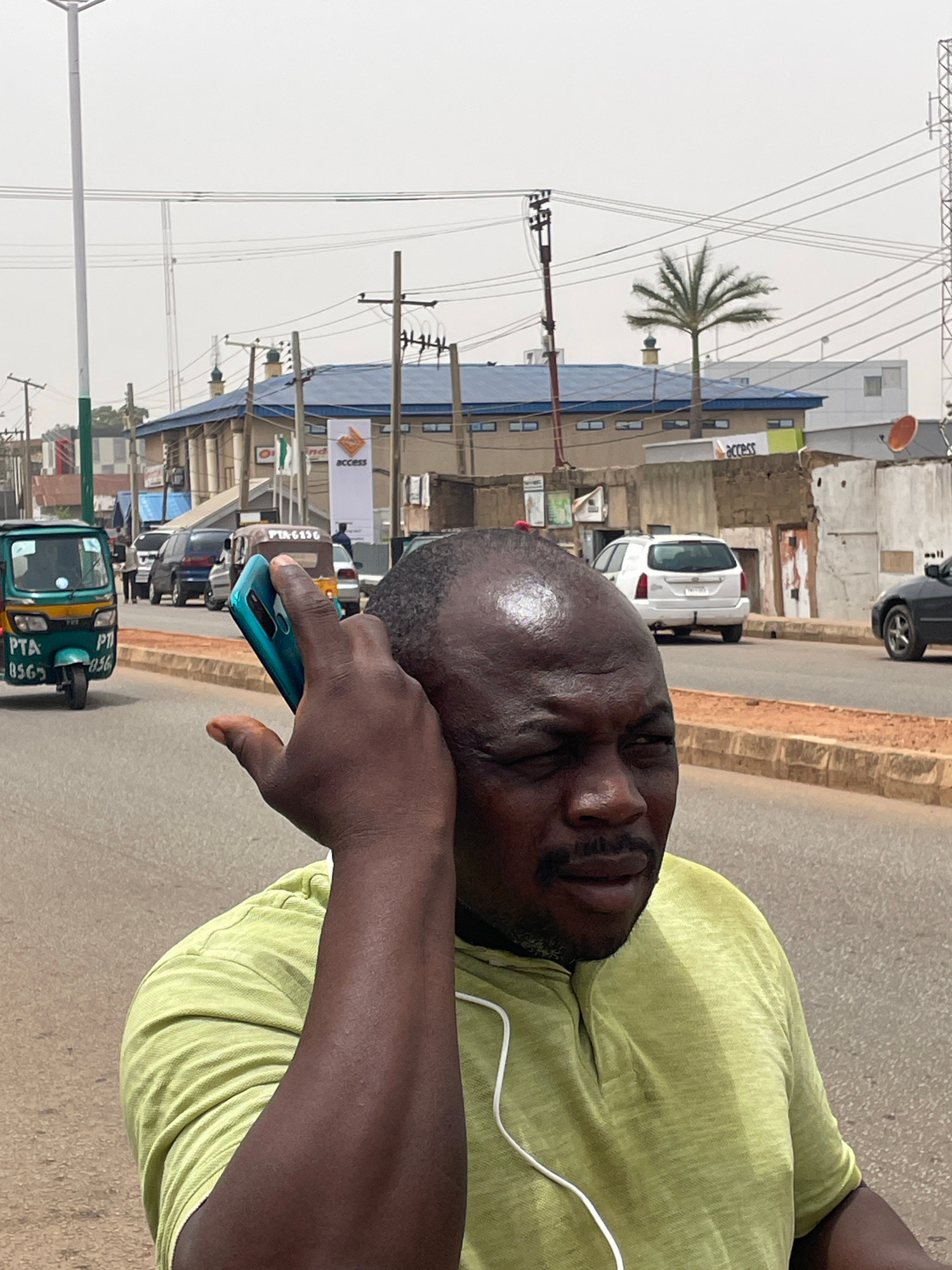 A close-up shot of a man with dark skin and a bald head, wearing a light green shirt and holding a turquoise smartphone, with his face and upper body taking up a large portion of the frame. He appears…read more