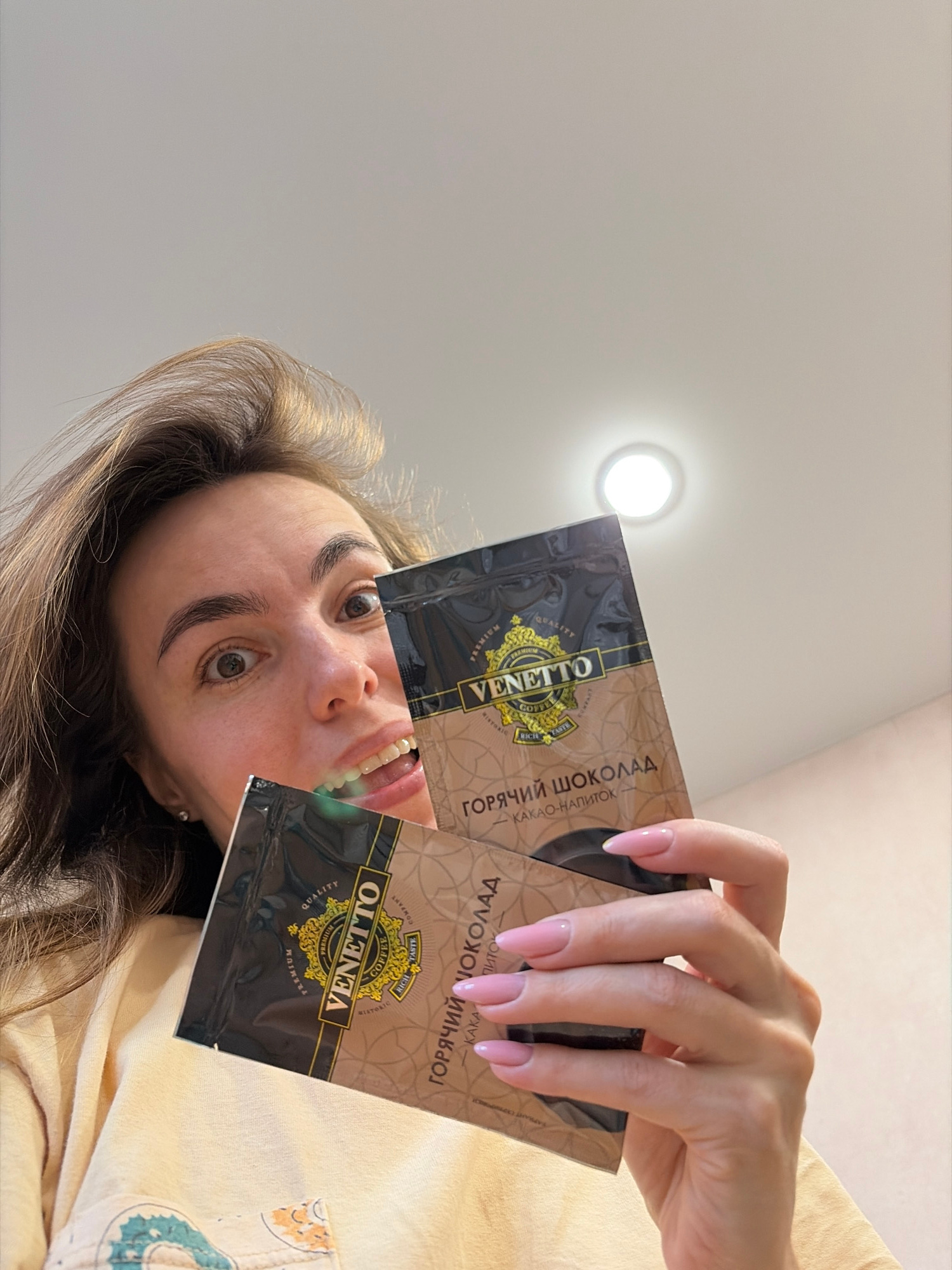 A woman is holding two packets of "Venetto" hot chocolate mix. The packaging includes Russian text. The woman is fair-skinned with brown hair and light pink fingernails. The photo is taken from a low…read more