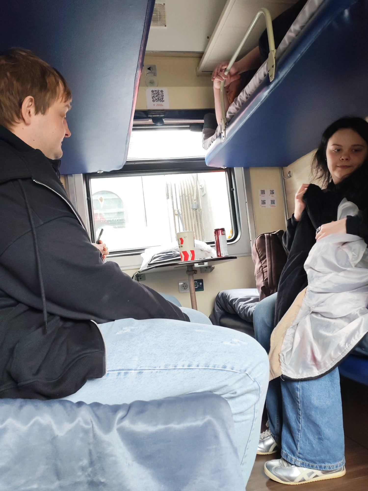 The image depicts the interior of a train compartment, likely a long-distance sleeper or couchette car, with three passengers. On the left, a man with light brown hair, wearing a black hooded jacket a…read more
