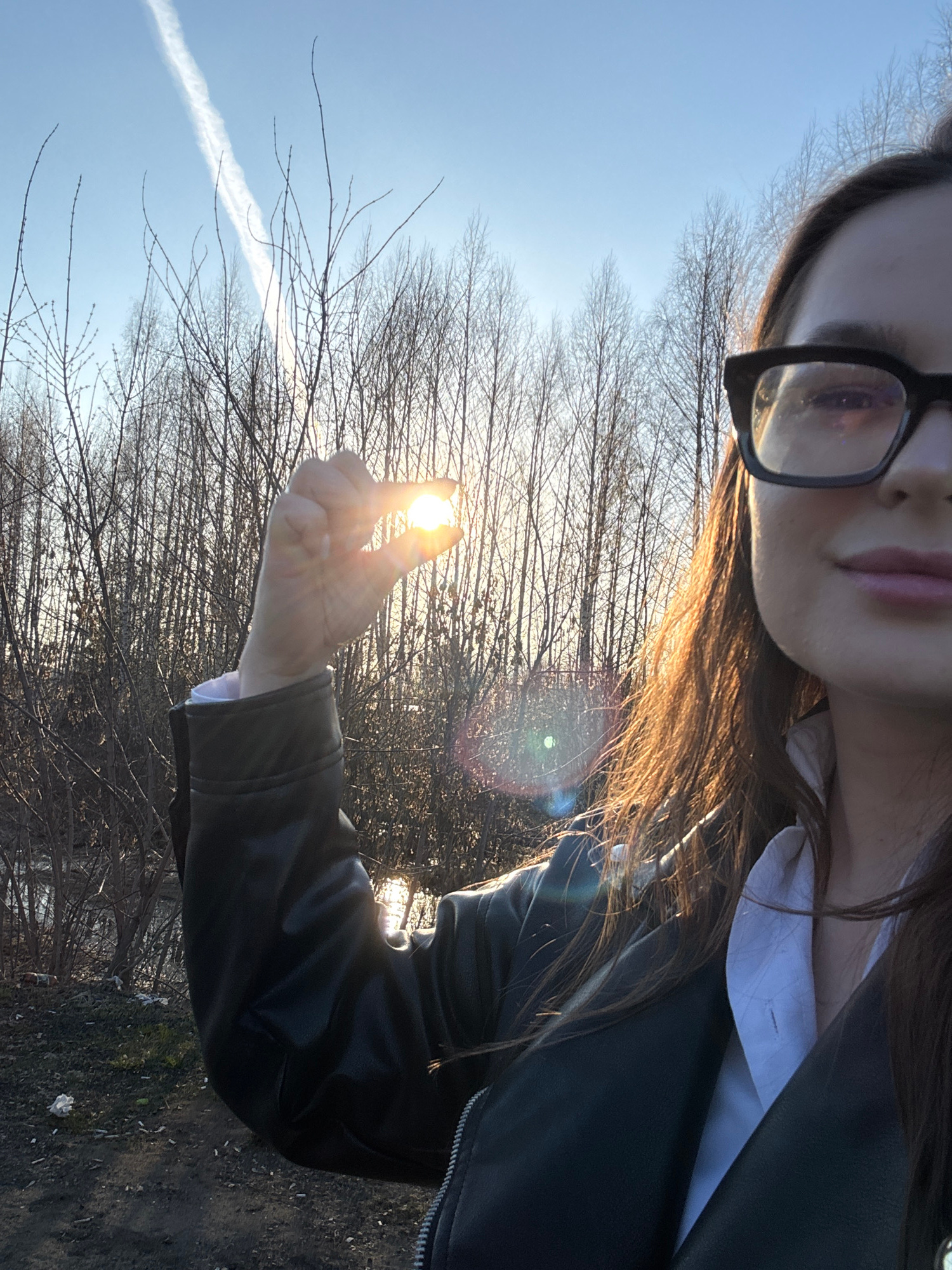 This media file captures a close-up, playful outdoor selfie, likely taken during either sunrise or sunset due to the low angle and golden glow of the sun. The subject is a person, appearing to be fema…read more