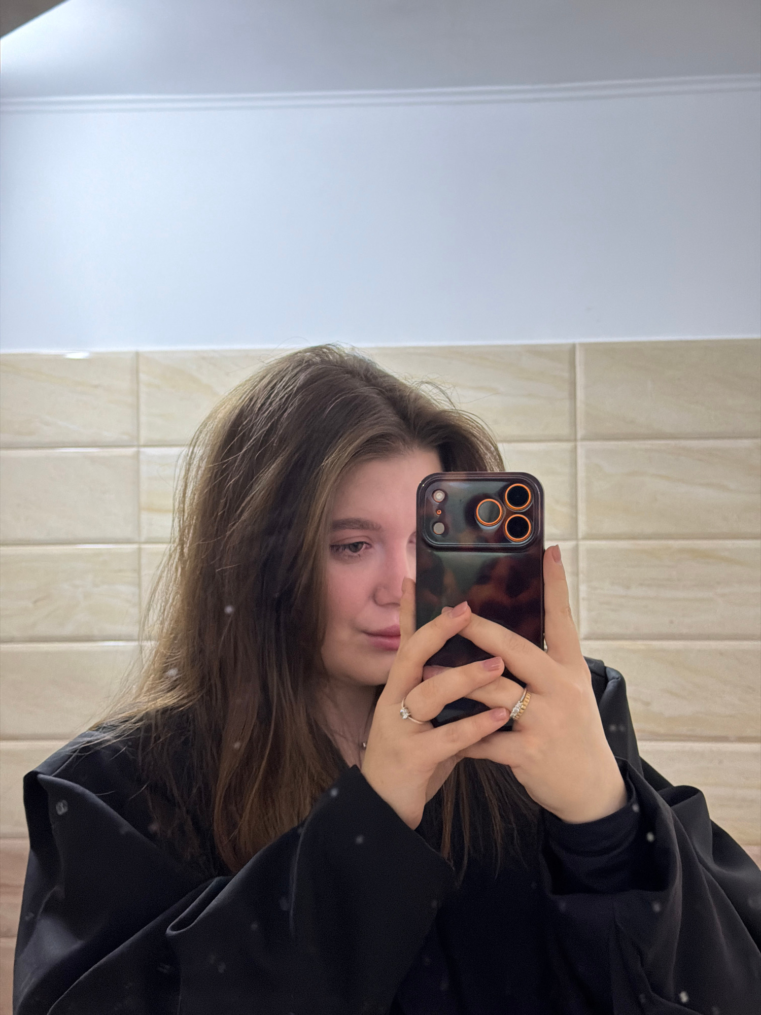 A young individual, likely female, is taking a mirror selfie. The image is oriented sideways, showing the person from the chest up. She has medium-length brown hair and is wearing a black long-sleeved…read more