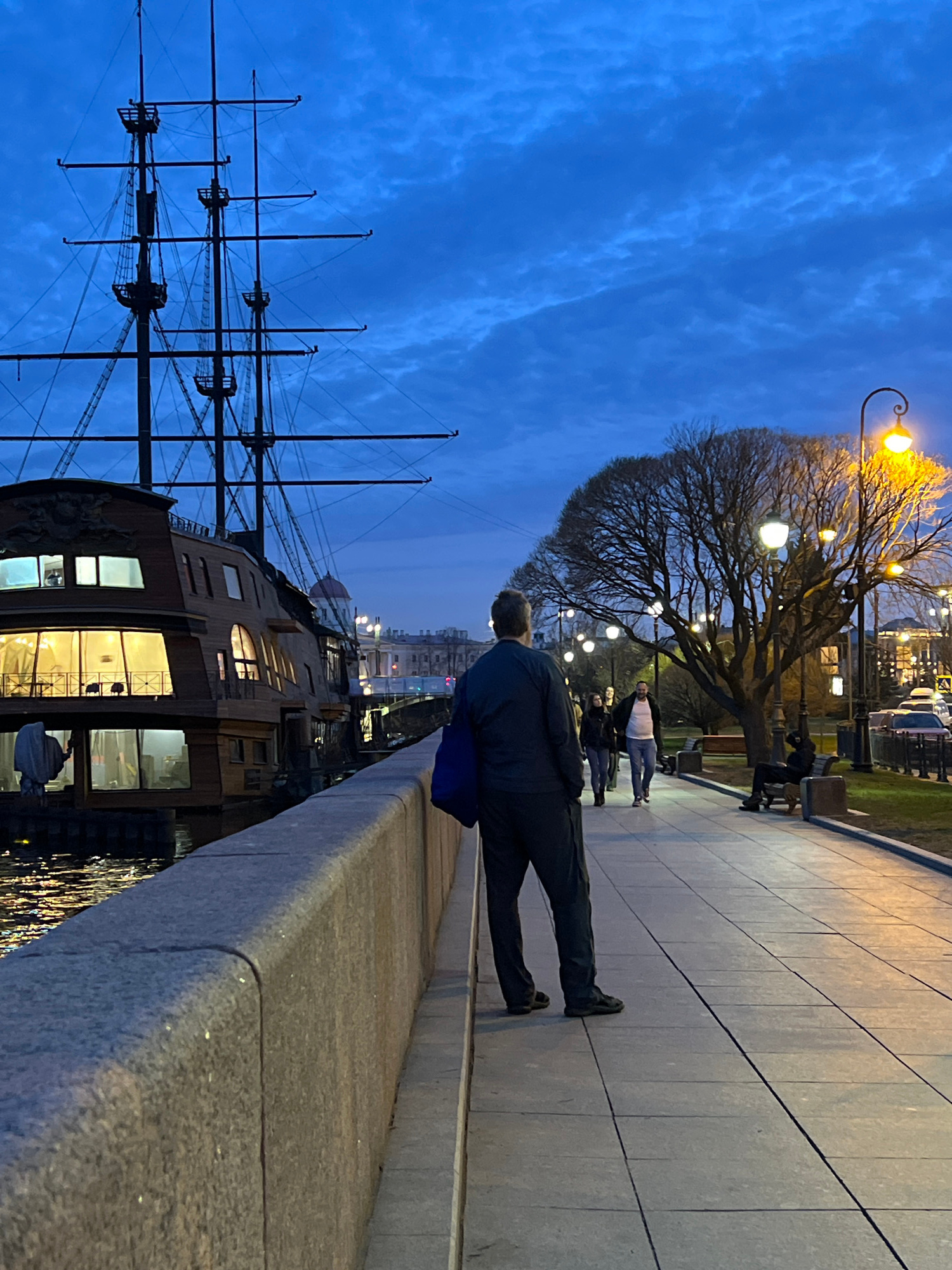 The image depicts a scene in Saint Petersburg, Russia, along a canal. A man stands on a granite embankment, looking out towards a historical ship docked in the canal. The ship's masts and rigging areβ¦read more
