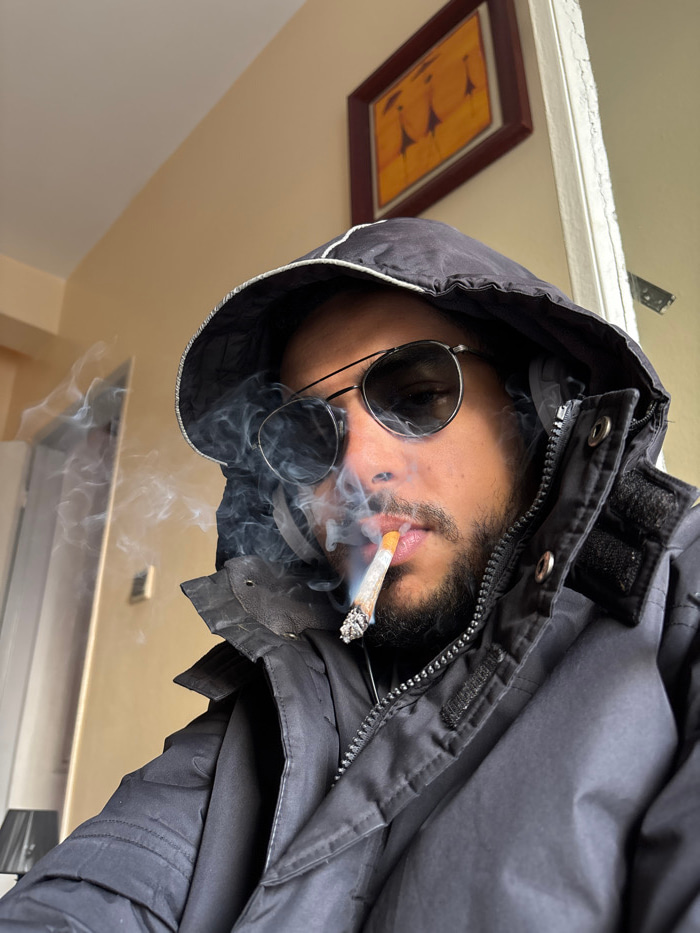 The image displays a close-up, eye-level view of a single individual in an indoor setting in Tangier, Morocco. The subject, a person with facial hair, occupies the majority of the frame, facing slight…read more