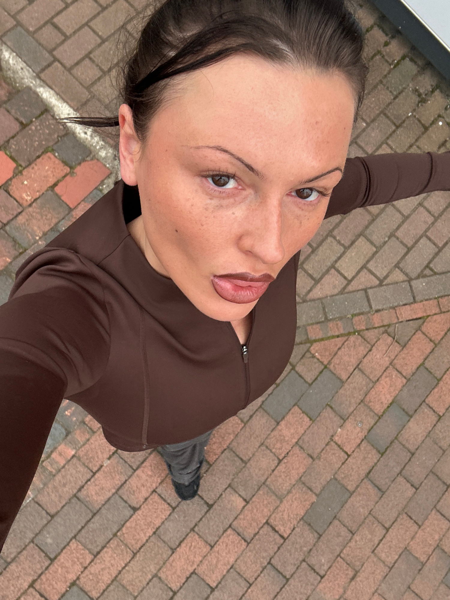 A person wearing a brown long-sleeved top and gray pants with black shoes stands on a brick walkway with a combination of red and gray bricks. The person is looking upward into the camera, with a view…read more