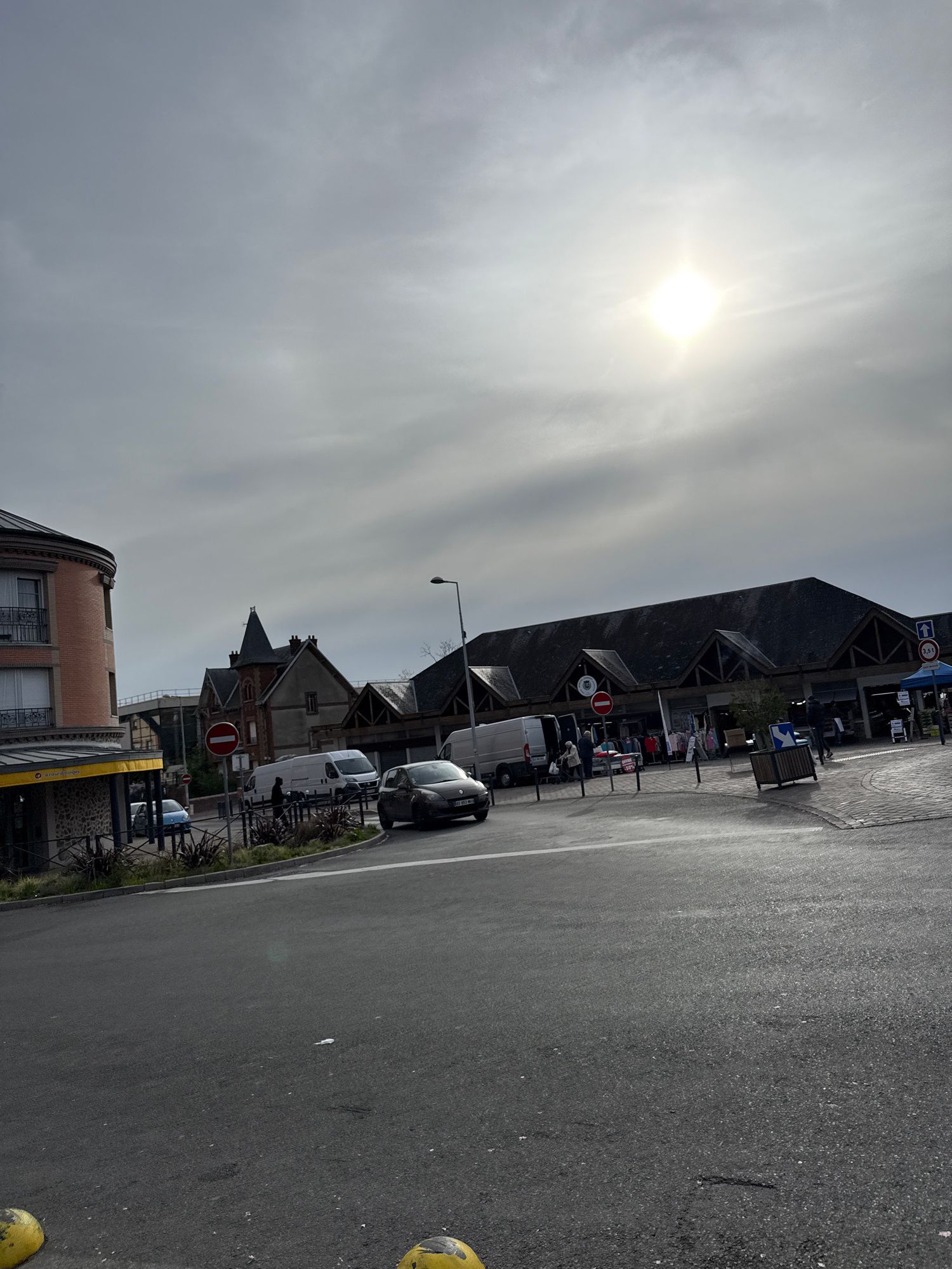 The image depicts a street scene in Domont, France, under an overcast sky with the sun visible through the clouds. The perspective is tilted, showing a downward view of a roadway with a row of buildin…read more