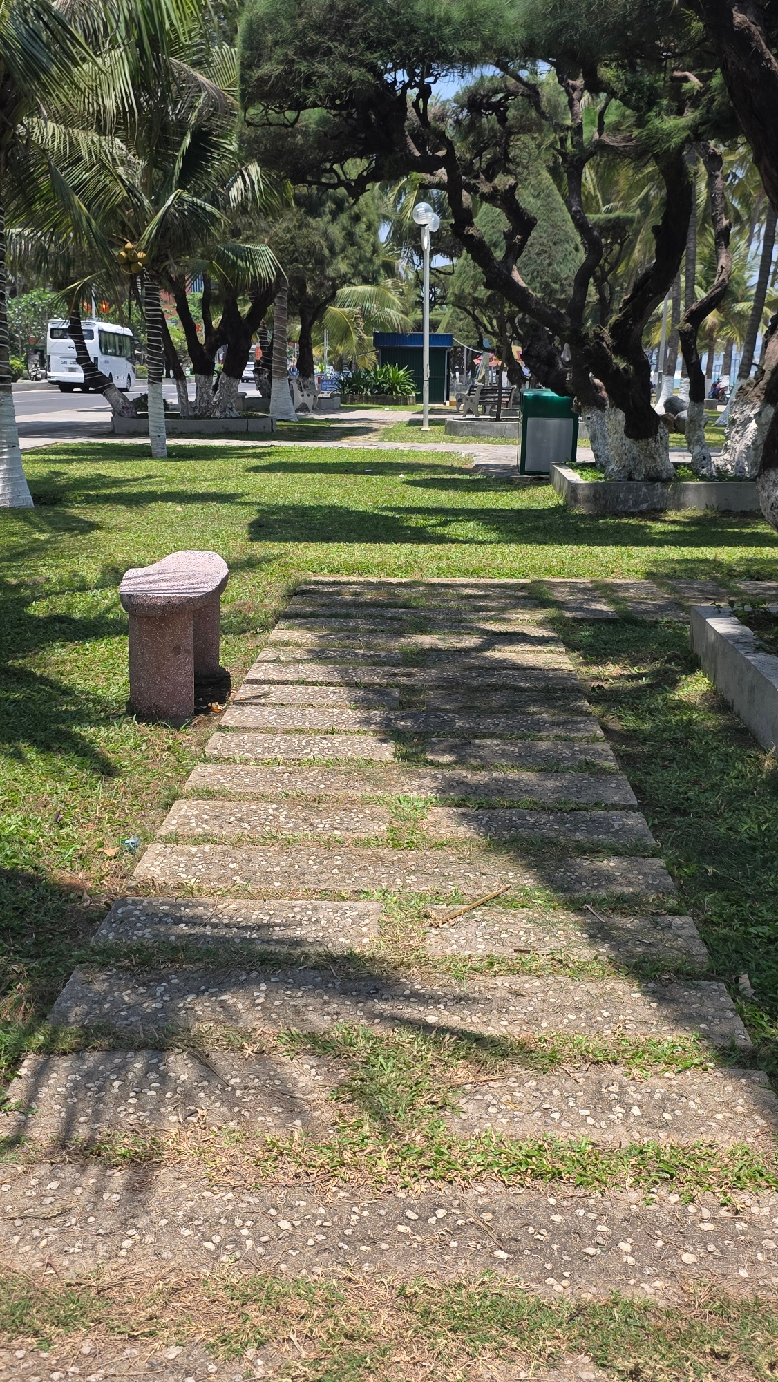 The image depicts a park setting in Nha Trang, Vietnam. On the left, dense foliage including palm trees and other trees with intricate branch structures, obscures part of a street scene with a white v…read more