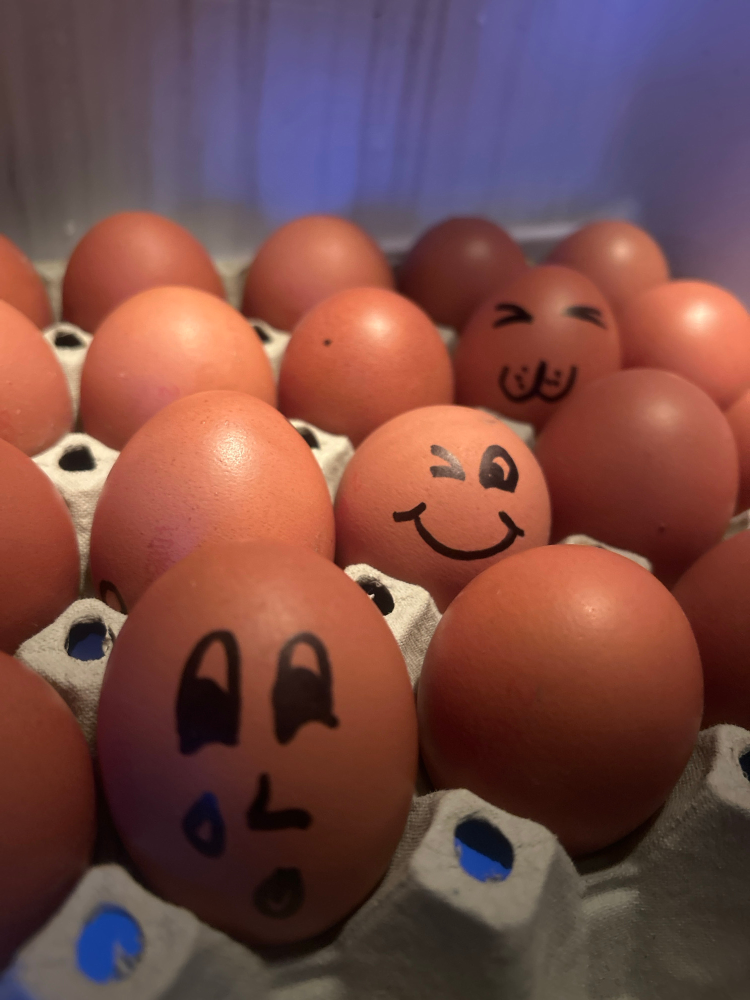 A close-up photograph depicts a carton of brown eggs, with several eggs decorated with drawn faces. One egg has a smiling face, while others have different expressions. The eggs are contained within a…read more