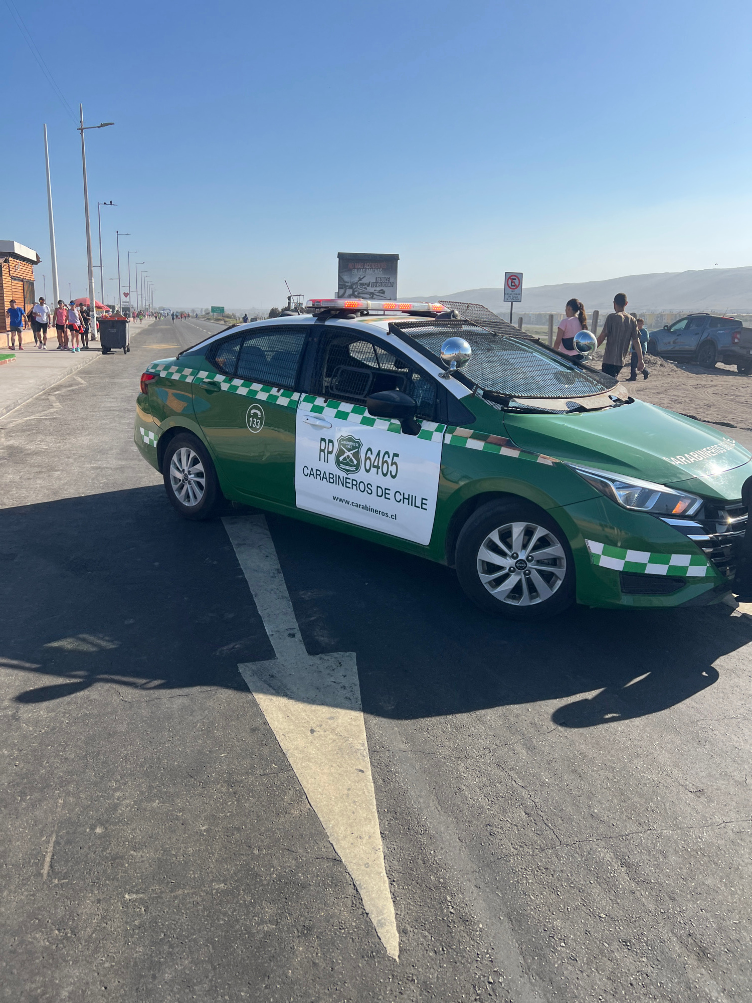 The image shows a Carabinero de Chile police car parked on a paved surface with a large white arrow painted on it. The car is green and white with checkered accents and displays the license plate "RP…read more