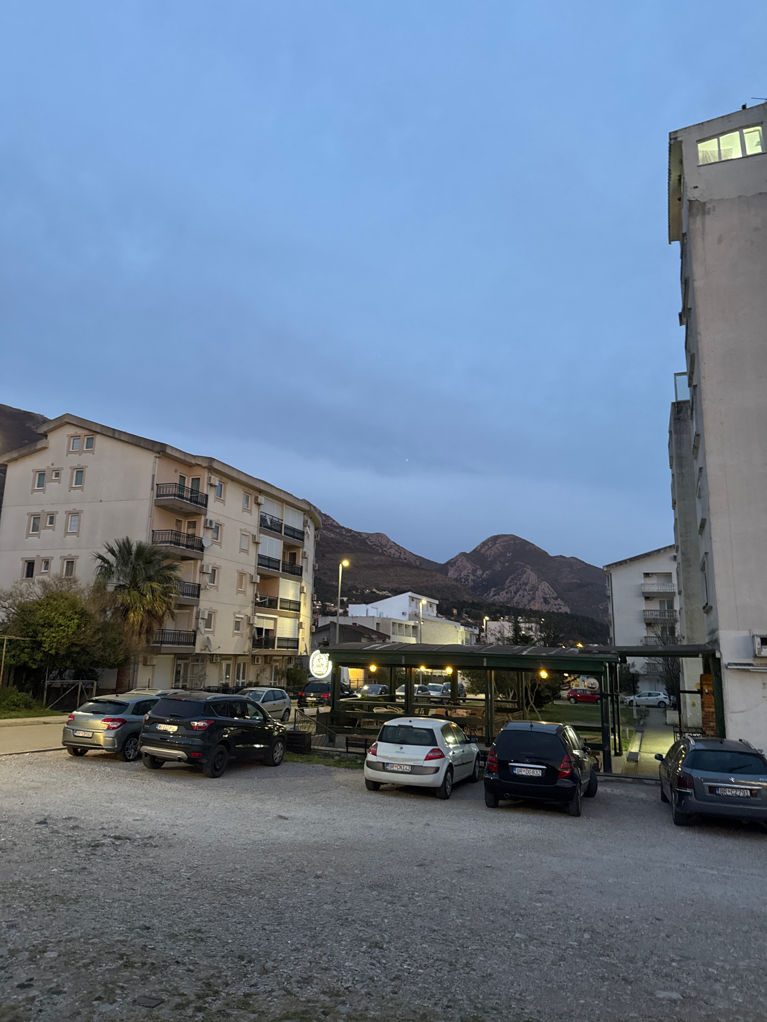 The image shows a street scene in Sutomore, Montenegro. It is dusk or early evening, indicated by the dim sky and streetlights. Several parked cars line the right side of the frame along an asphalt or…read more