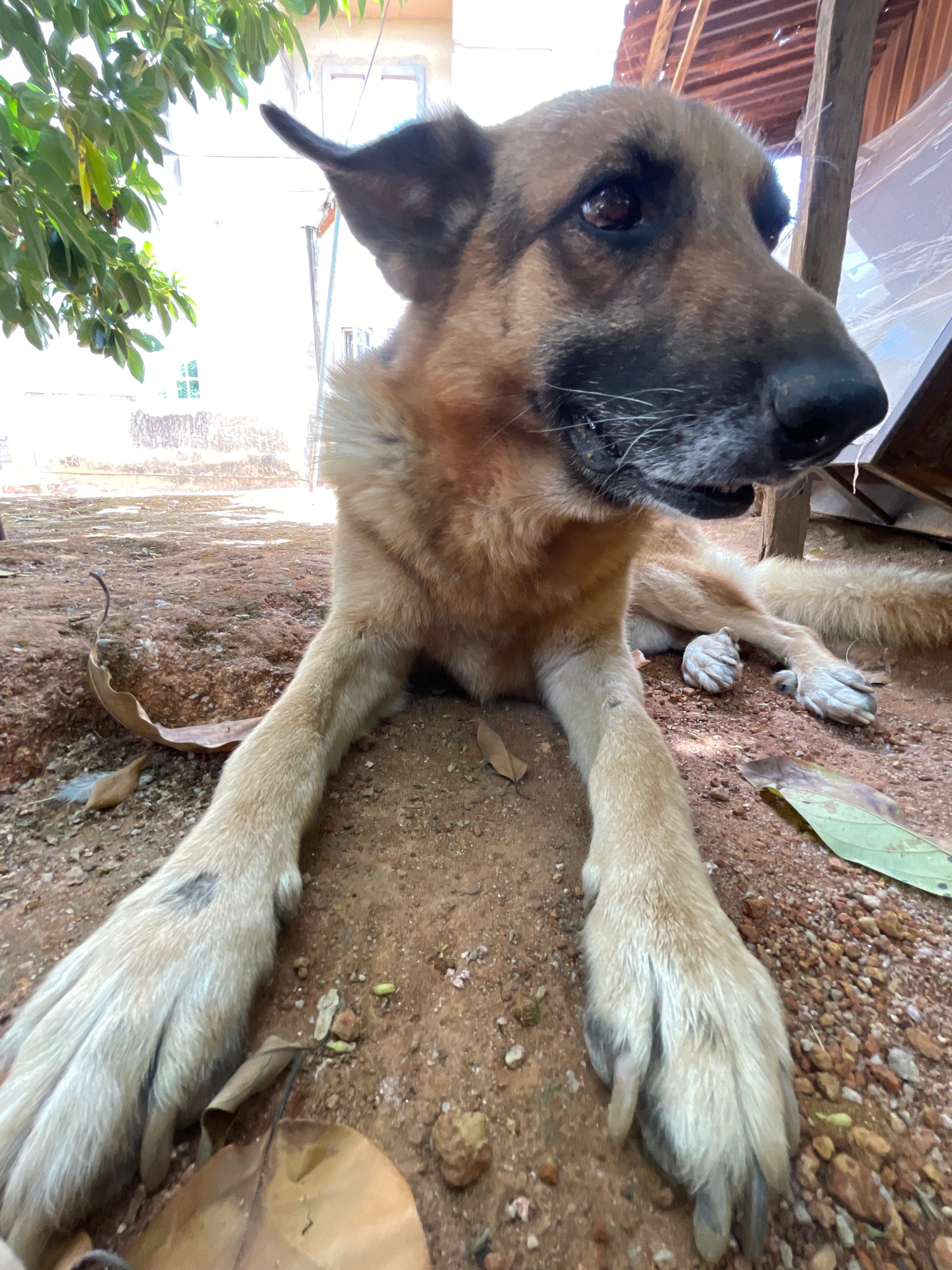 The image depicts a medium-sized, brown and black dog lying on a reddish-brown dirt surface with scattered pebbles and leaves. The dog is positioned close to the camera, with its head tilted upwards.…read more