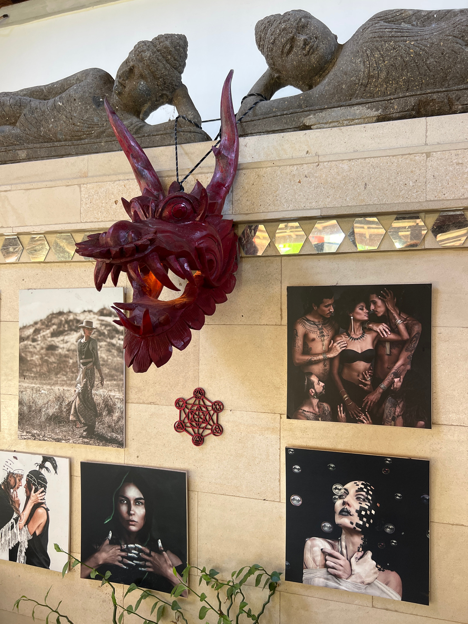 The image depicts an indoor scene in Sukawati, Indonesia. A gray stone statue of a figure supports a wall, adjacent to a strip of hexagonal mirrored tiles. A large, red, ornate dragon head with protru…read more