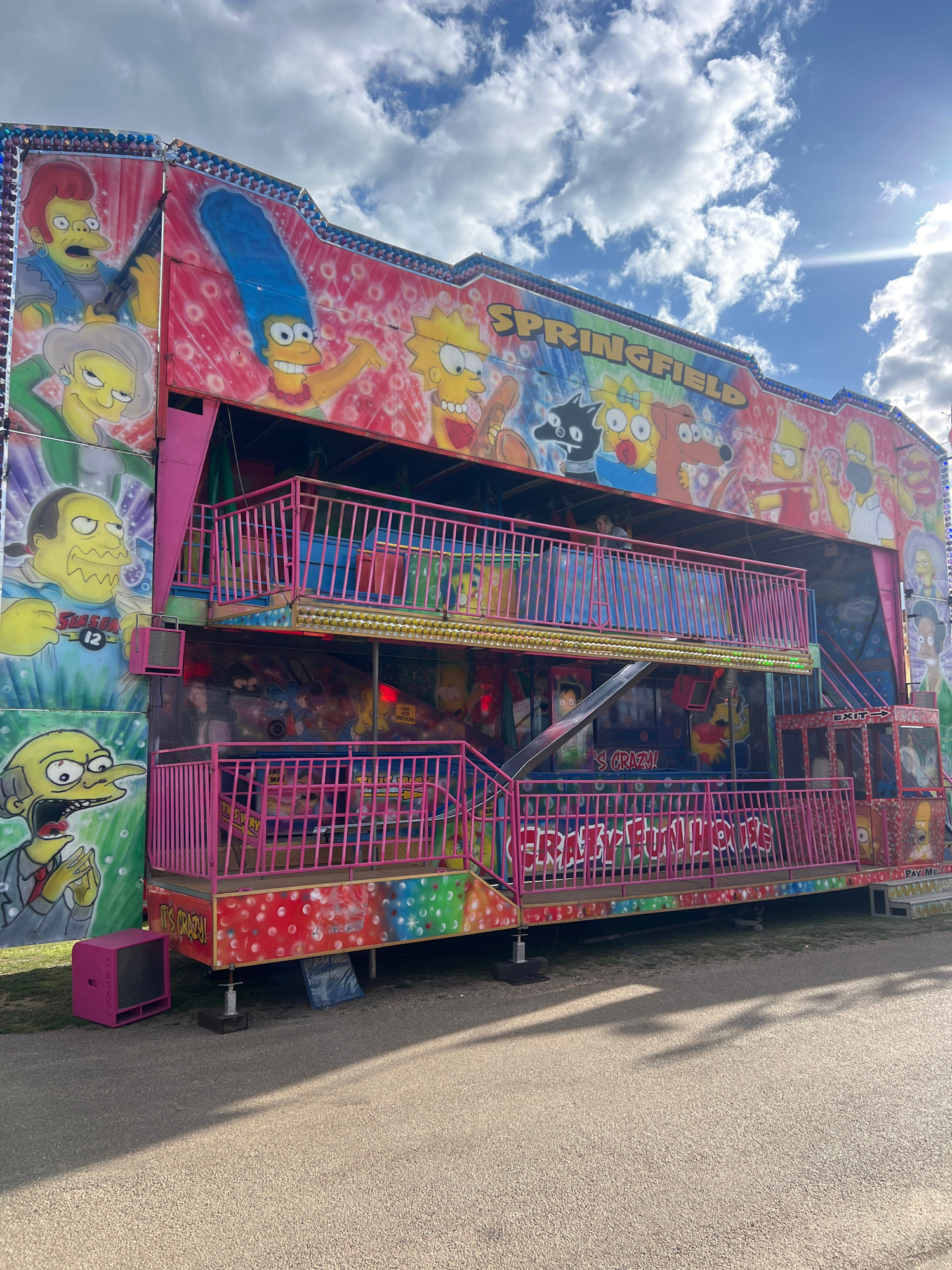 The image shows a multi-level funhouse attraction, likely part of a fair or carnival. The structure is decorated with images of the Simpsons characters. The name "SPRINGFIELD" is visible at the top of…read more