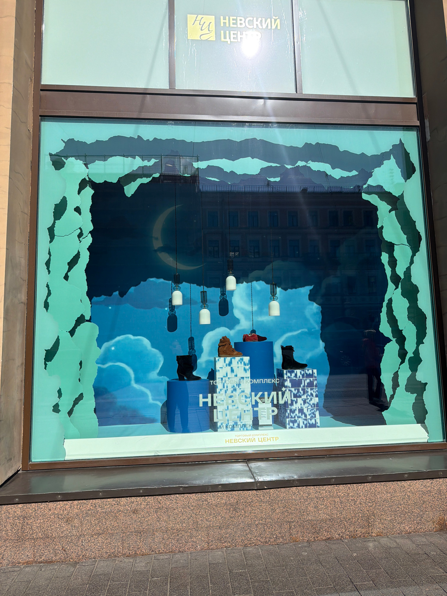 The image shows a window display of "Nevsky Center," a shopping mall in Saint Petersburg, Russia. The window has a stylized nighttime scene with a crescent moon, clouds, and what appears to be a citys…read more