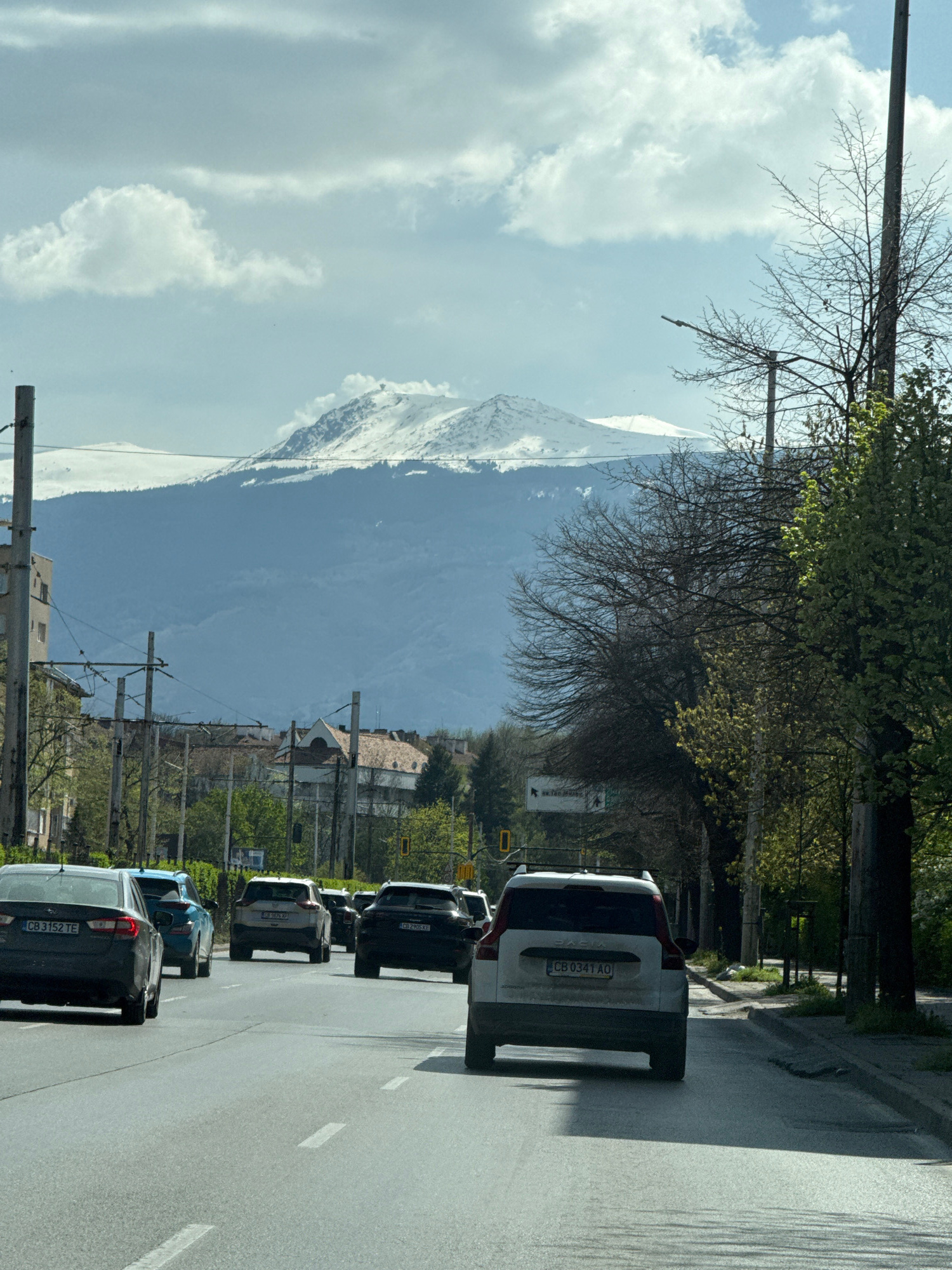 The image presents an urban street scene in Sofia, Bulgaria, looking towards the majestic, snow-capped Vitosha Mountain under a partly cloudy sky. The perspective is from inside a vehicle, observing a…read more