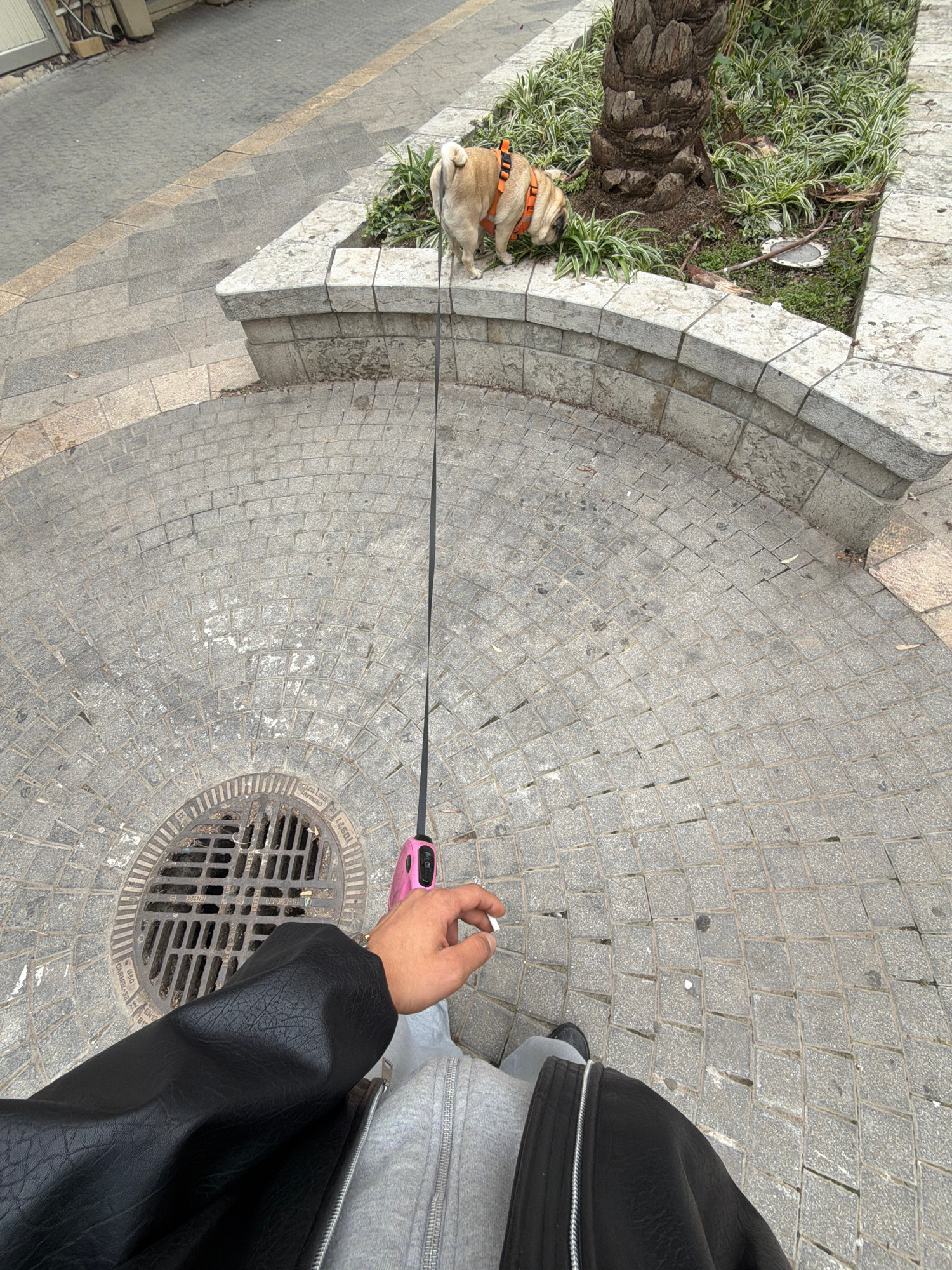 A pug wearing an orange harness lies on a patch of greenery next to a stone ledge. A black leash connects the pug to a pink retractable leash held by a person standing on a gray tiled sidewalk. The pe…read more
