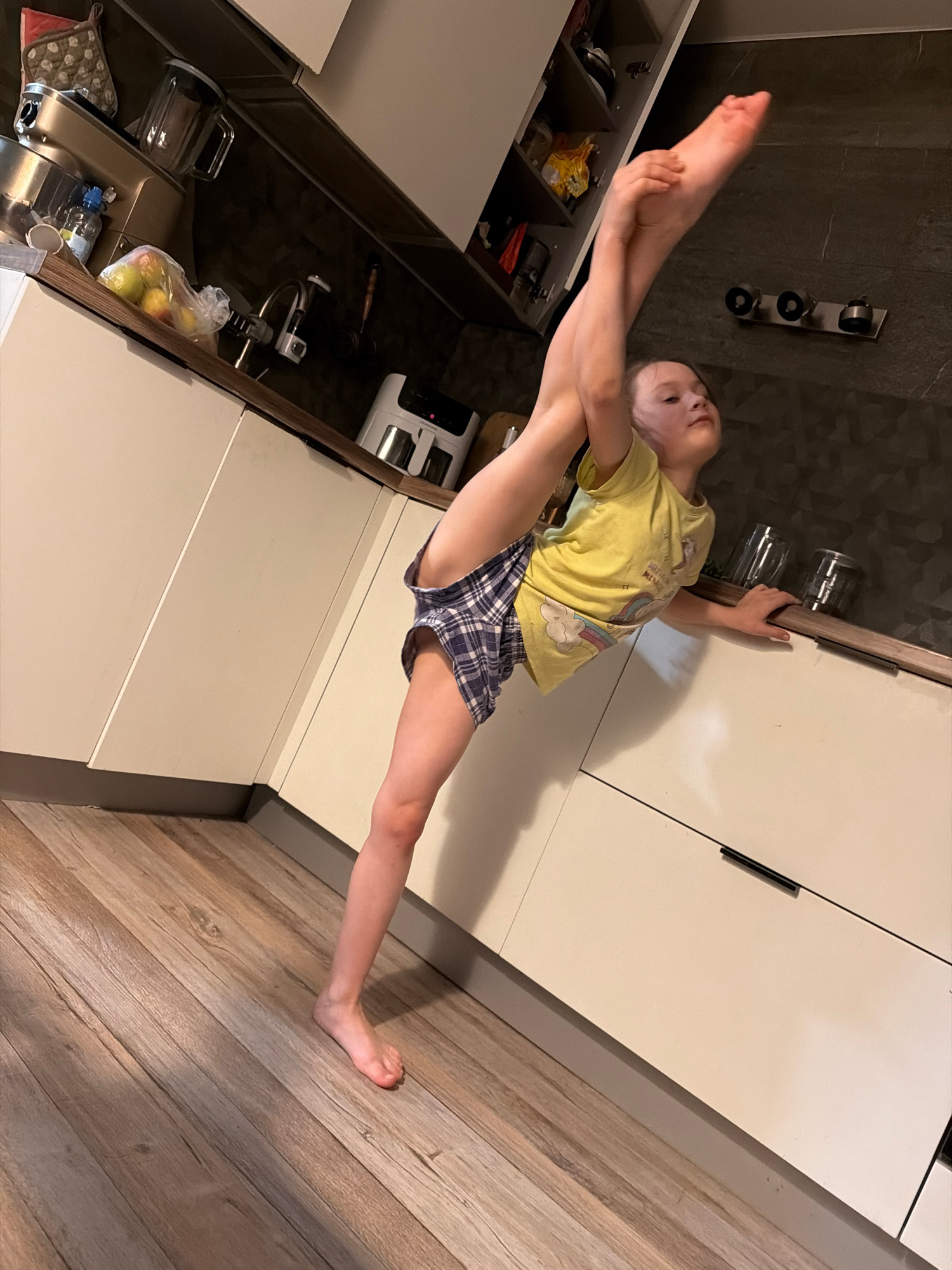 A young girl performs an impressive full split in what appears to be a modern kitchen. The image is rotated 90 degrees clockwise, making her appear to be doing a vertical split between the kitchen ele…read more