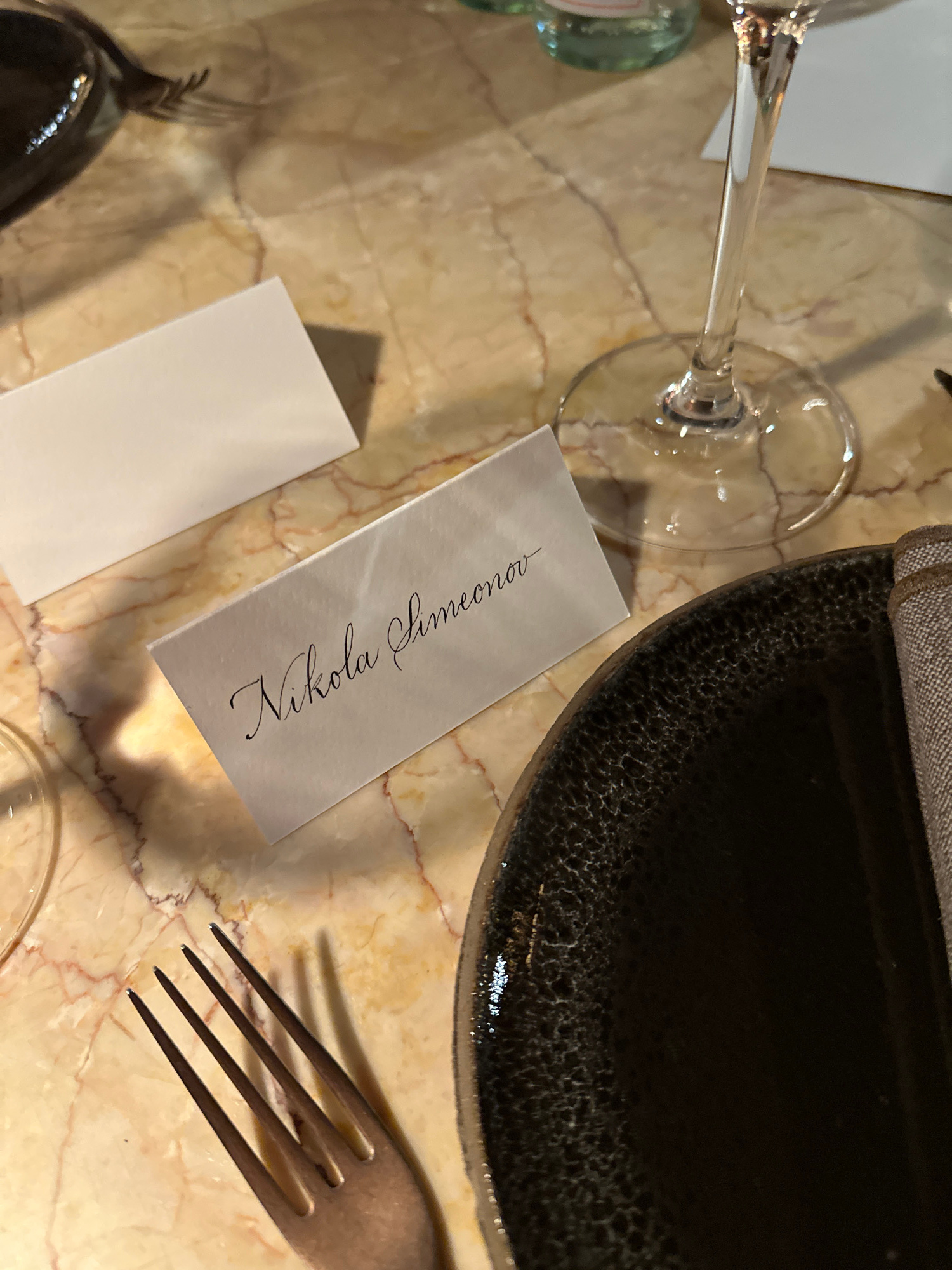 The image captures a close-up, overhead view of a place setting at a dining table, likely in a restaurant or formal setting in Madrid, Spain. The table surface is a polished light-colored marble with…read more