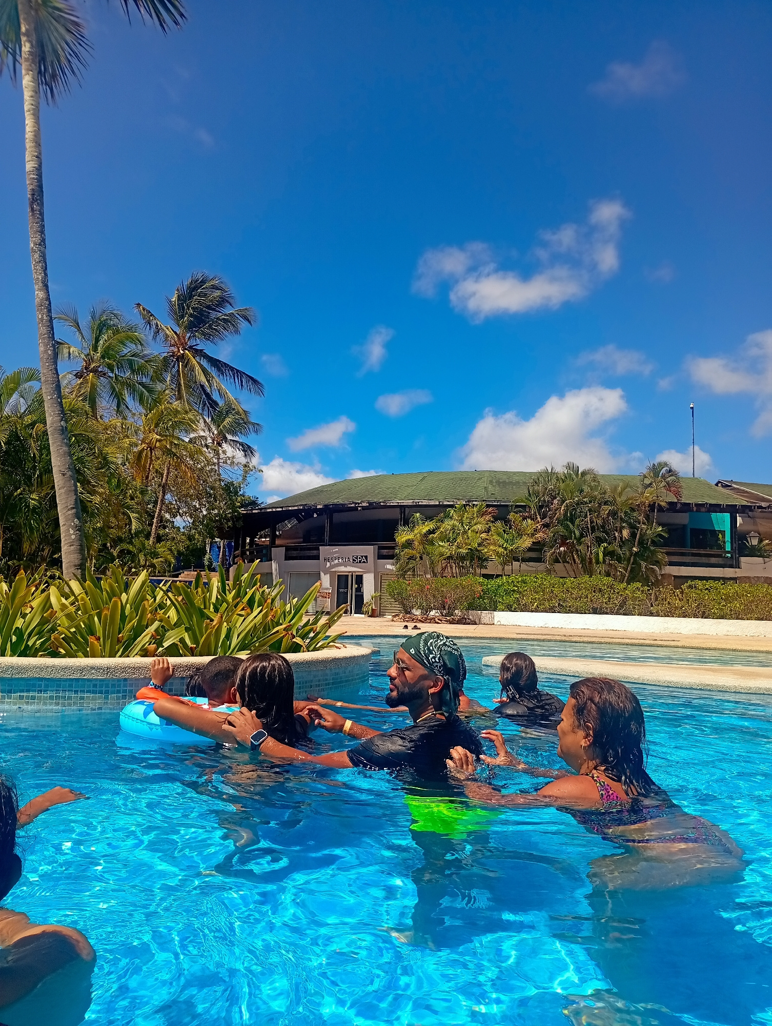 The scene is an outdoor swimming pool at the Hesperia Isla Margarita hotel in Playa El Agua, Venezuela, under a bright blue sky with scattered white cumulus clouds. In the background, a multi-story bu…read more