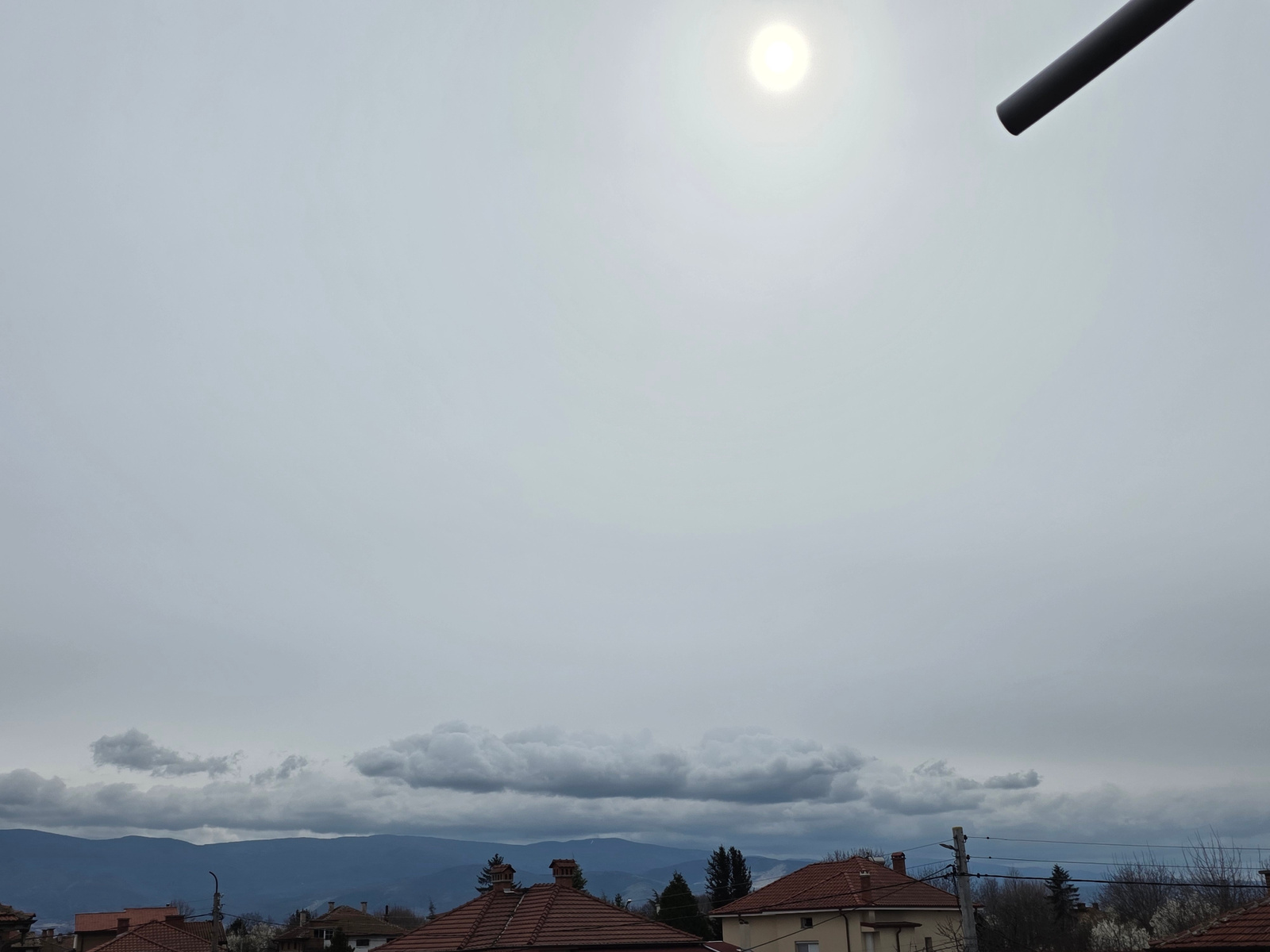 The image shows an overcast sky above the town of Yagodovo, Bulgaria. The sun is visible as a bright, diffused orb through the cloud cover. A section of a grey pipe is visible in the upper right corne…read more