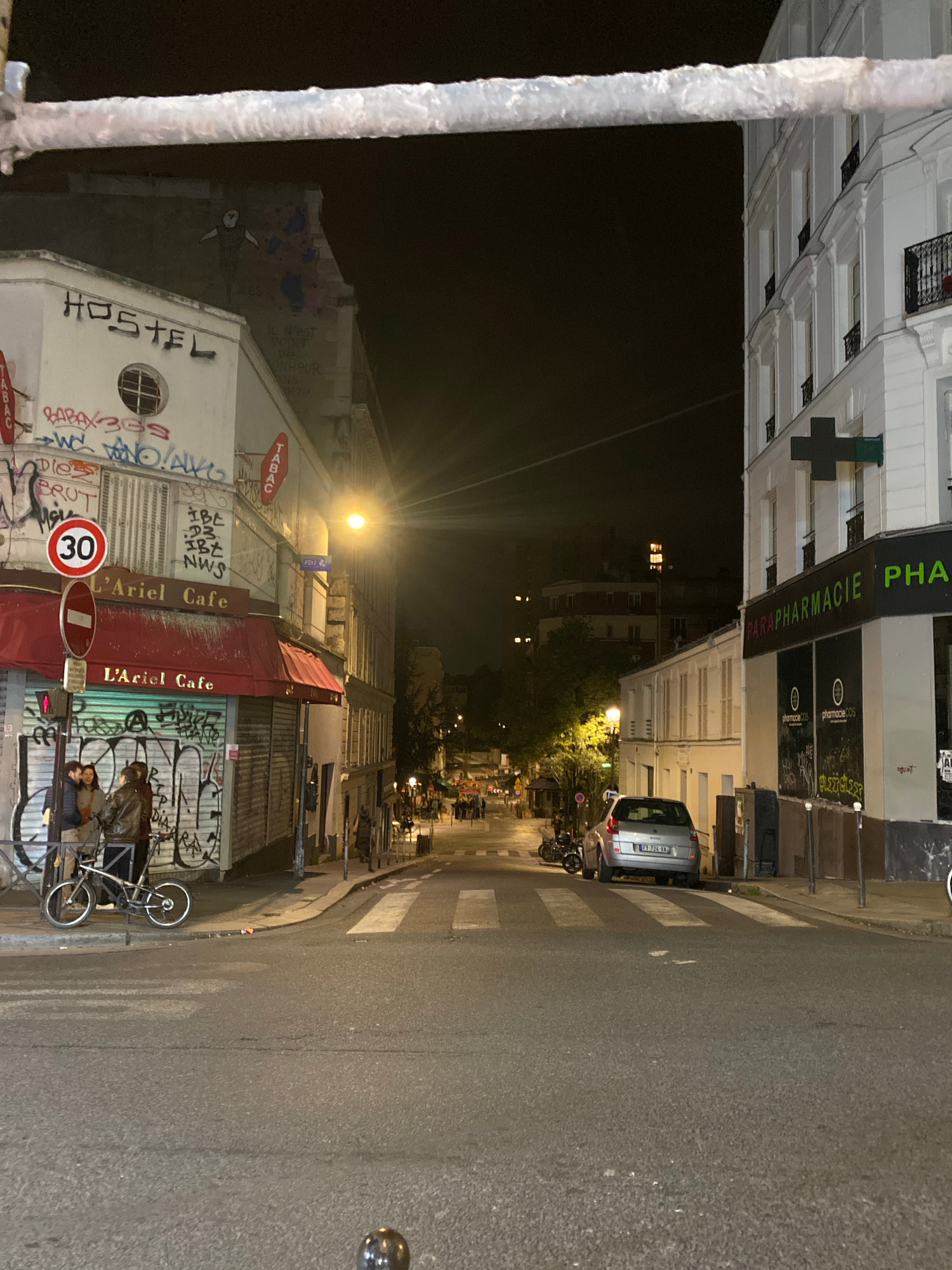 The image depicts a street scene in Paris, France at night. The view is looking down the street, with buildings on either side. On the left, a building with "HOSTEL" written on it and graffiti, and a…read more