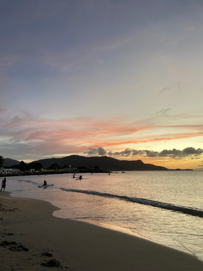 A beach scene during sunset. Soft waves roll onto the sand, reflecting the golden light. Silhouetted mountains form a backdrop. People are seen on paddleboards in the water and walking along the shore…read more