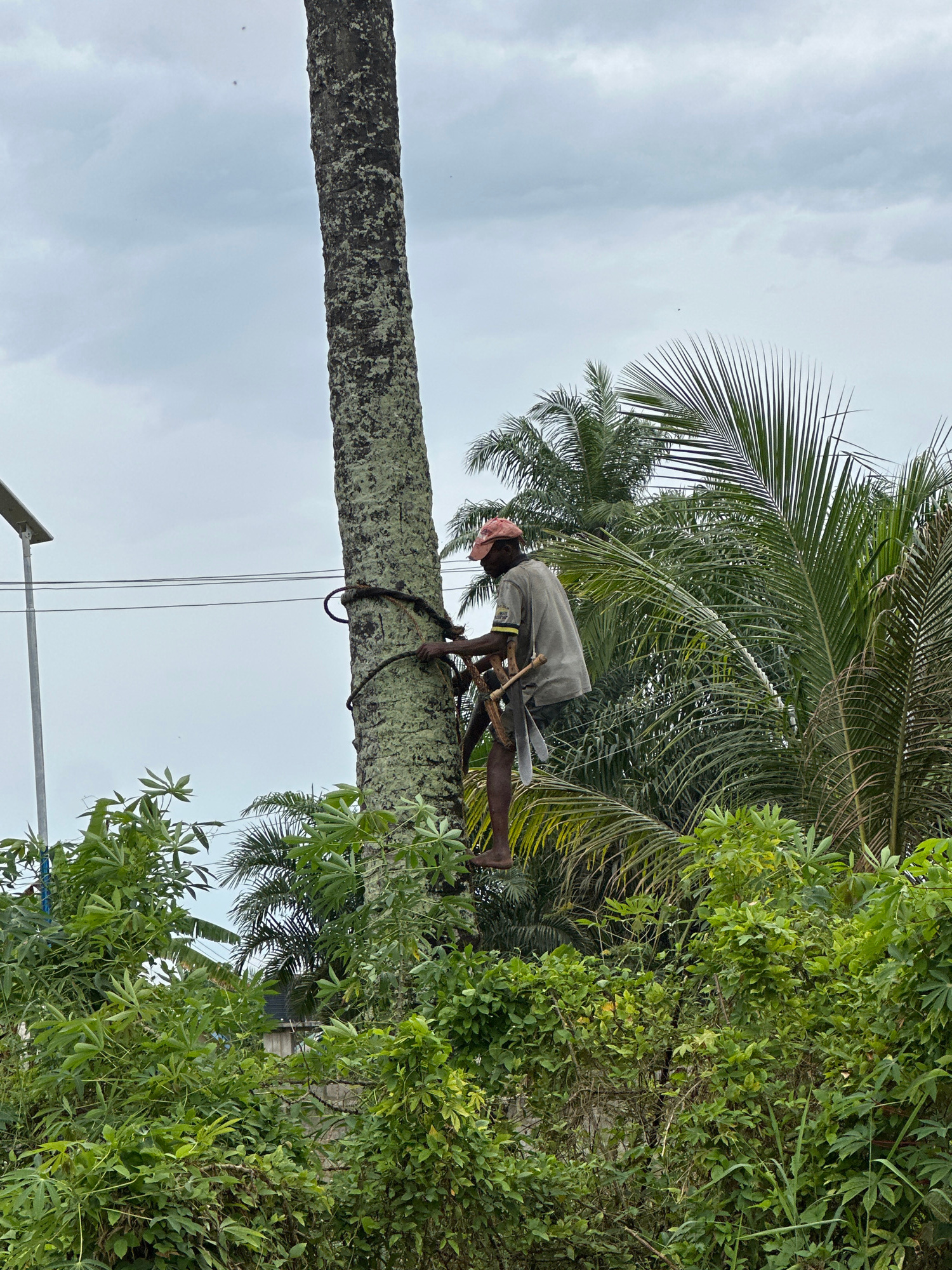 A man climbs a coconut tree in Ikot Ekpene, Nigeria. He wears a light-colored shirt, shorts, and a pink head covering. He is secured to the tree with a rope and appears to be cutting branches with a machete strapped to a wooden frame. The tree is tall and textured, with power lines visible nearby. Lush green foliage surrounds the scene, partially obscuring a building. The sky is overcast. | Open Wire