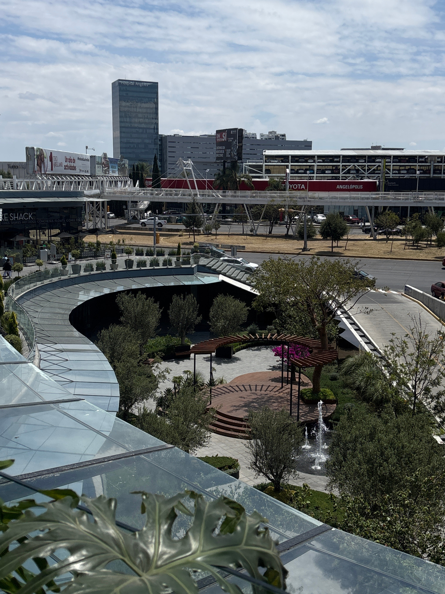 The image shows a view from a high vantage point, likely a building, overlooking a section of San Bernardino Tlaxcalancingo, Mexico. In the distance are buildings, including a tall skyscraper labele…read more