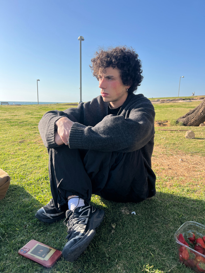 A young adult male is depicted seated on green grass in a coastal park in Tel-Aviv, Israel. The Mediterranean Sea and a clear blue sky are visible in the background. The male subject has dark, curly h…read more