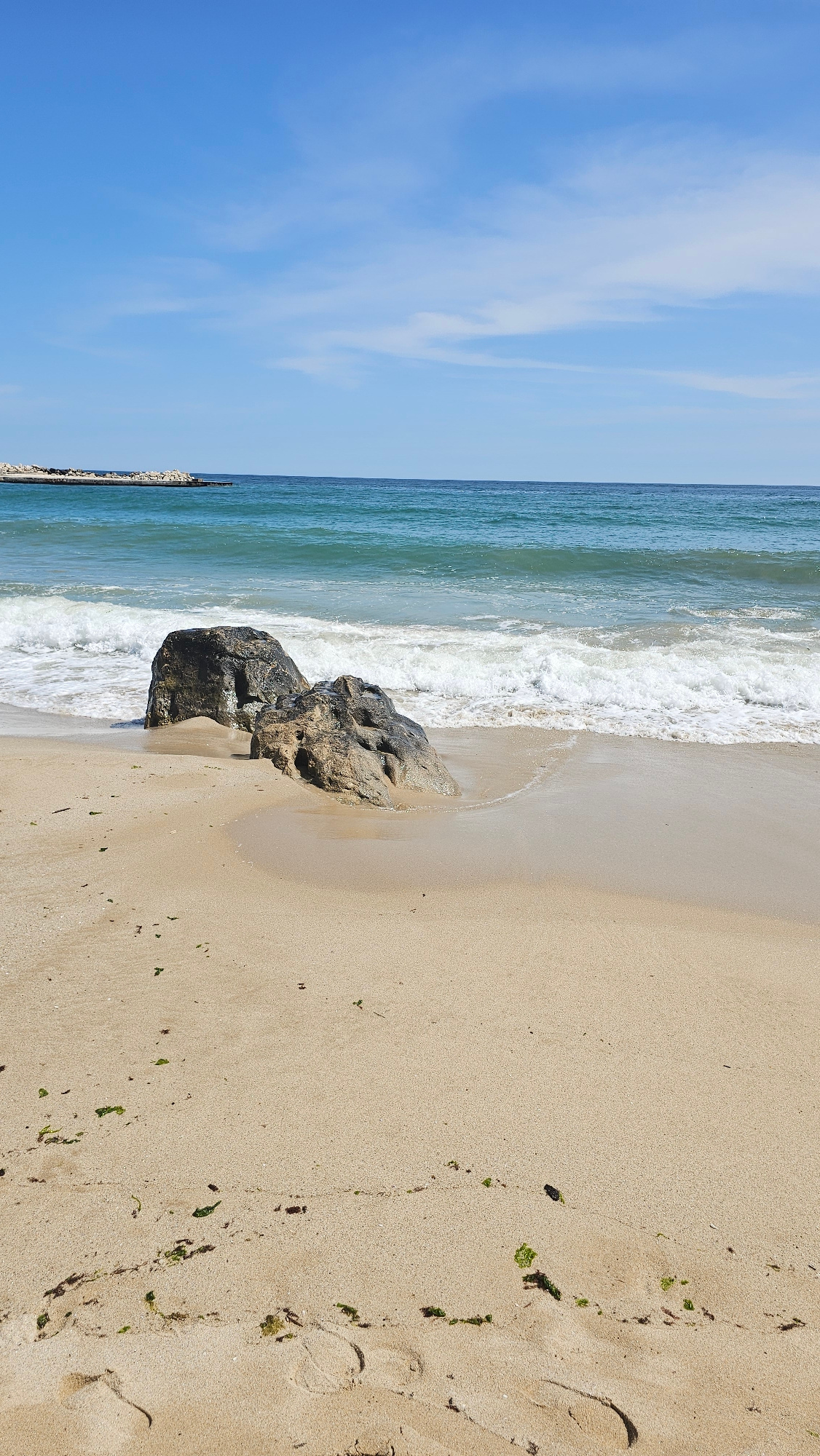 A tranquil, horizontal landscape photograph captures a peaceful beach scene in Varna, Bulgaria, under a clear sky. The image is divided into three primary horizontal elements: the sky, the sea, and th…read more