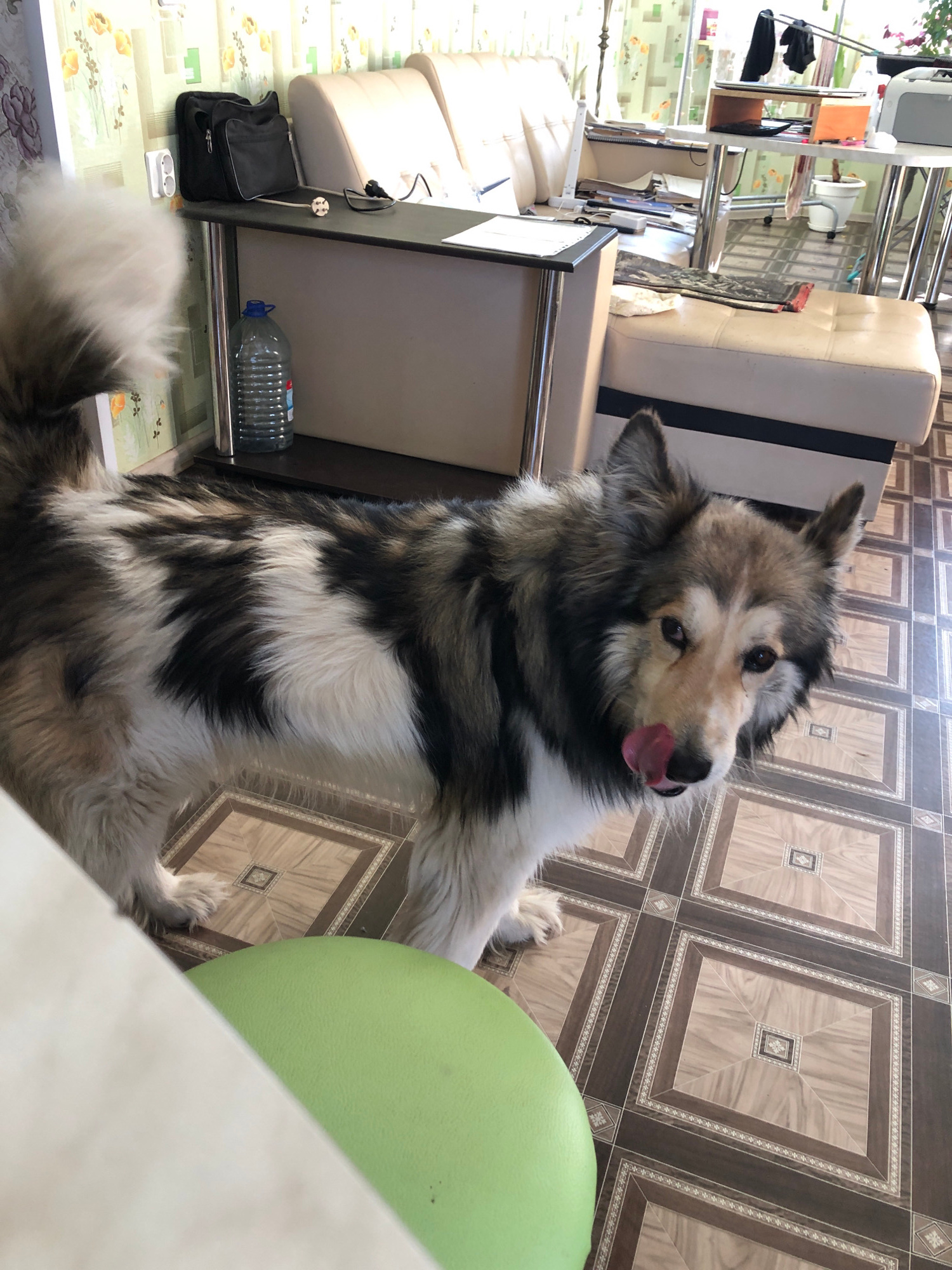 A medium-sized dog, primarily white, gray, and black, is standing on its hind legs, tongue extended, possibly licking its nose, indoors. The dog is positioned near a green, rounded object, likely a ch…read more