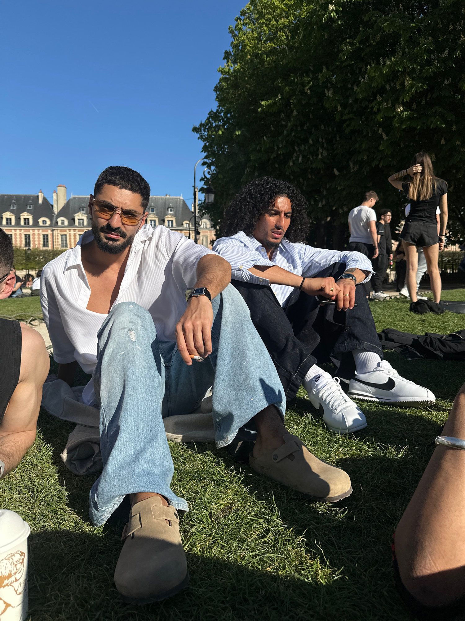 The image shows two men sitting on grass, seemingly in a park in Paris, France. One man wears a white, unbuttoned shirt, light blue jeans, brown sandals, and sunglasses, while the other wears a light…read more