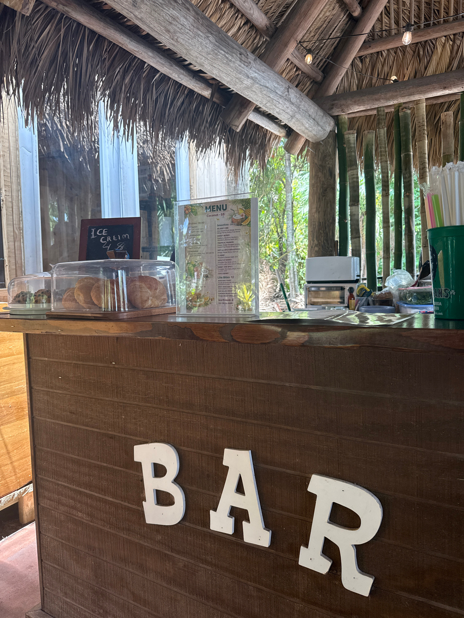 Here is a description of the image: The image shows an outdoor bar with a thatched roof structure. A menu and a display case with pastries and a sign for ice cream are visible on the bar's surface. T…read more