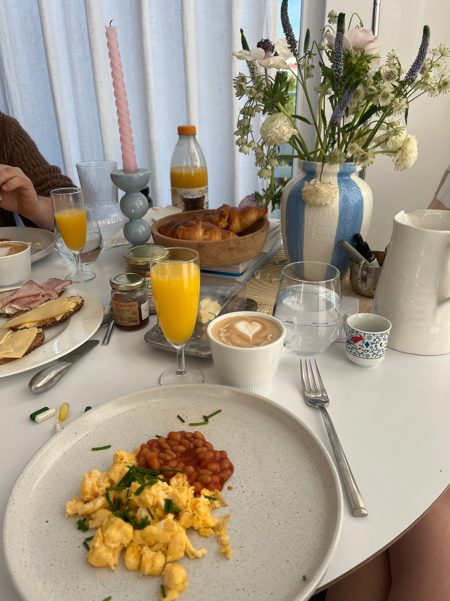 A photograph depicts a breakfast table setting indoors. The table is predominantly white, and various breakfast items are arranged on it. The food items include scrambled eggs, baked beans, croissant…read more