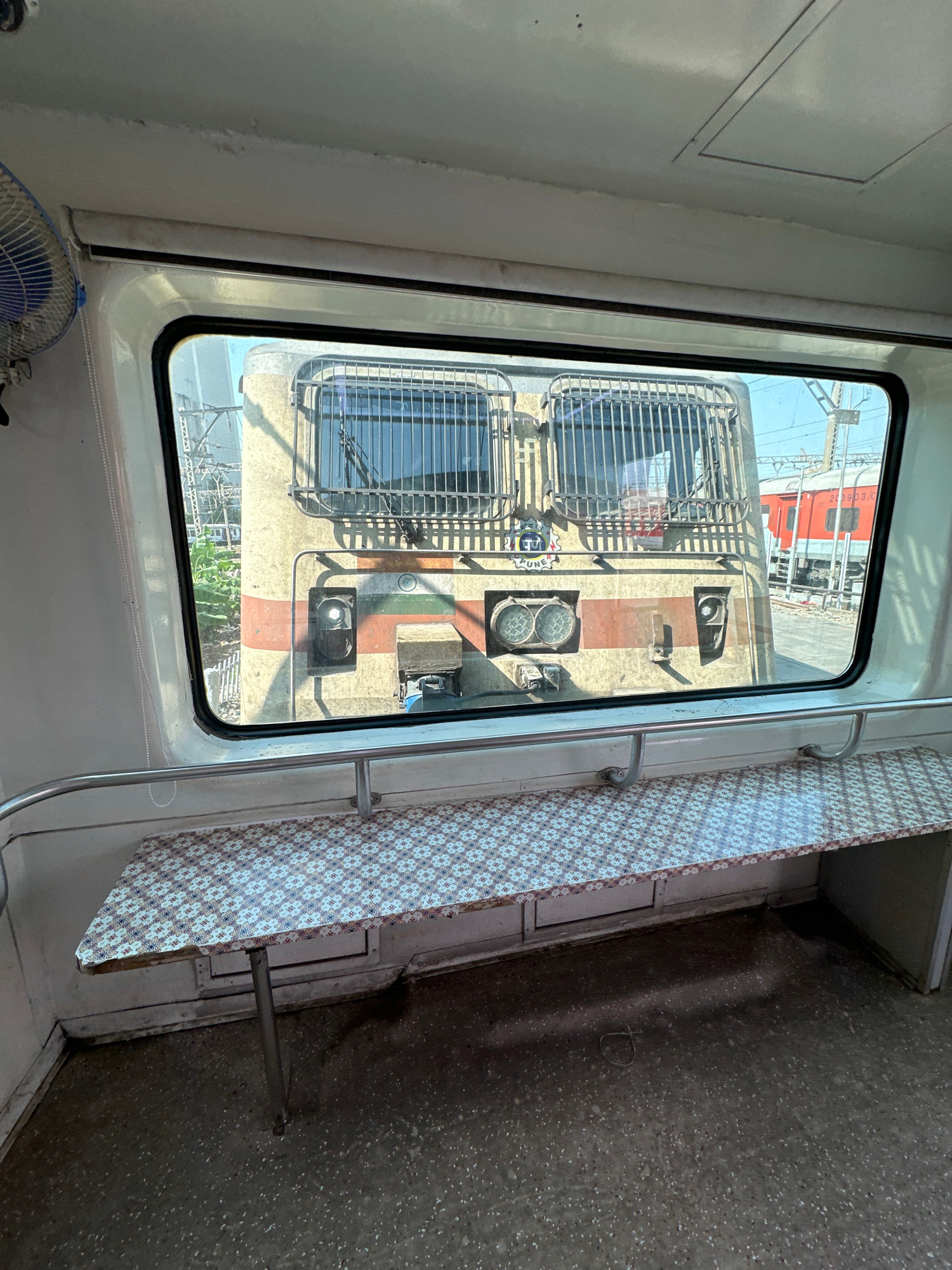 The interior of a train compartment in Mumbai, India. The camera is positioned near a window, angled to capture the view outside. Through the window, another train engine is visible, painted in beige…read more