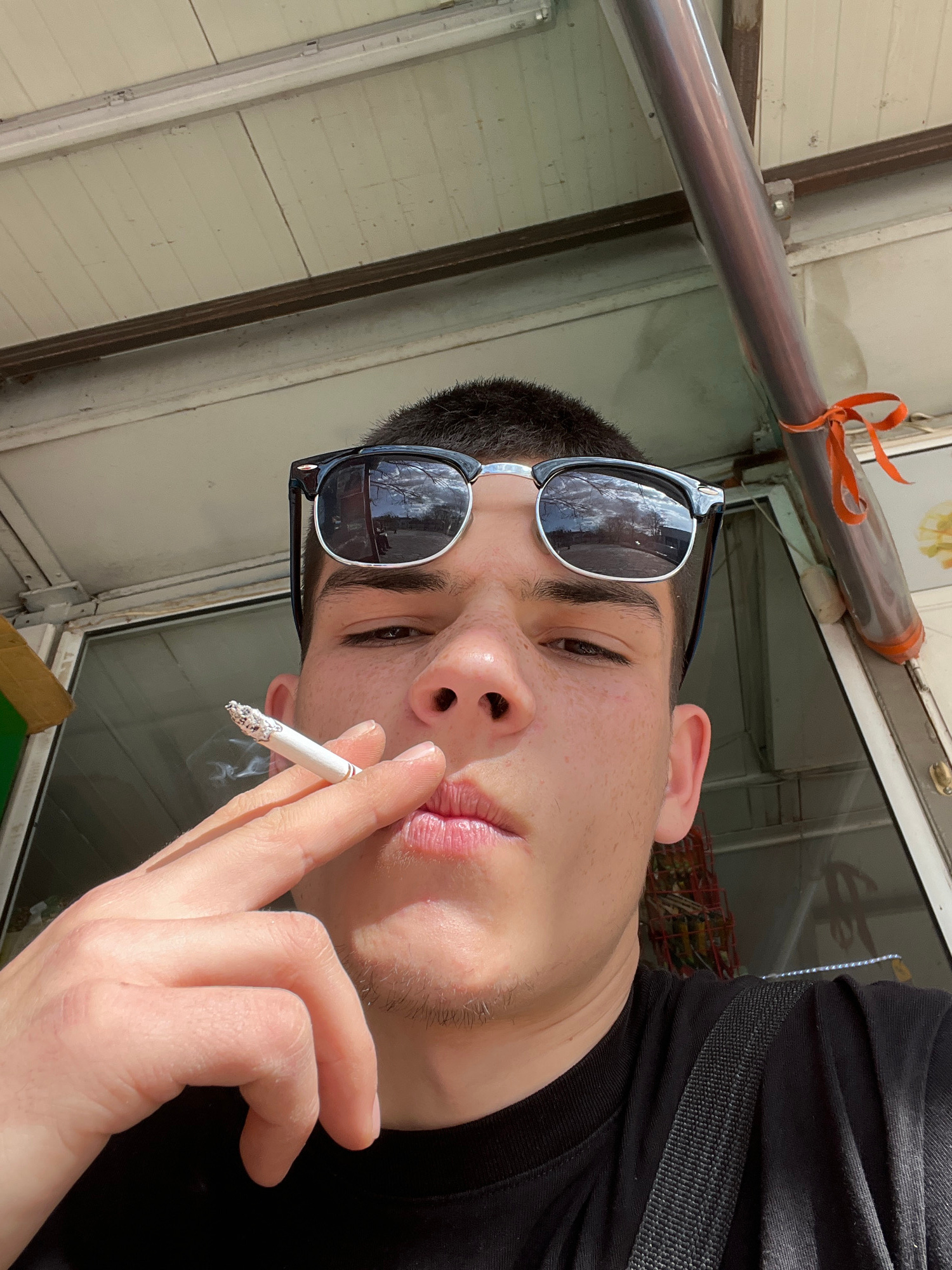 The image displays a young man, seen from a slightly elevated perspective, with his head tilted to the left. He is in the act of smoking a cigarette, holding it to his lips with his right hand, and a…read more