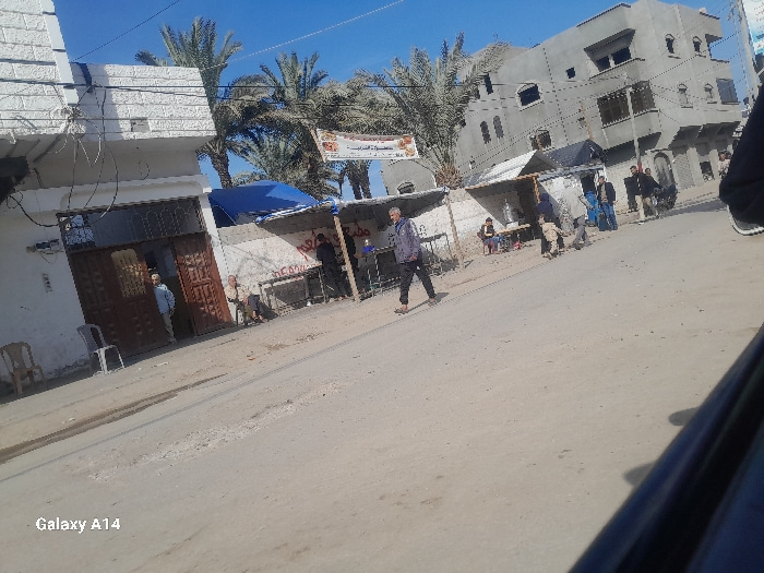 The image captures an outdoor street scene in Deir el-Balah, Palestinian Territory, on a bright, sunny day. The perspective is slightly tilted, possibly taken from inside a vehicle, with a dark area i…read more