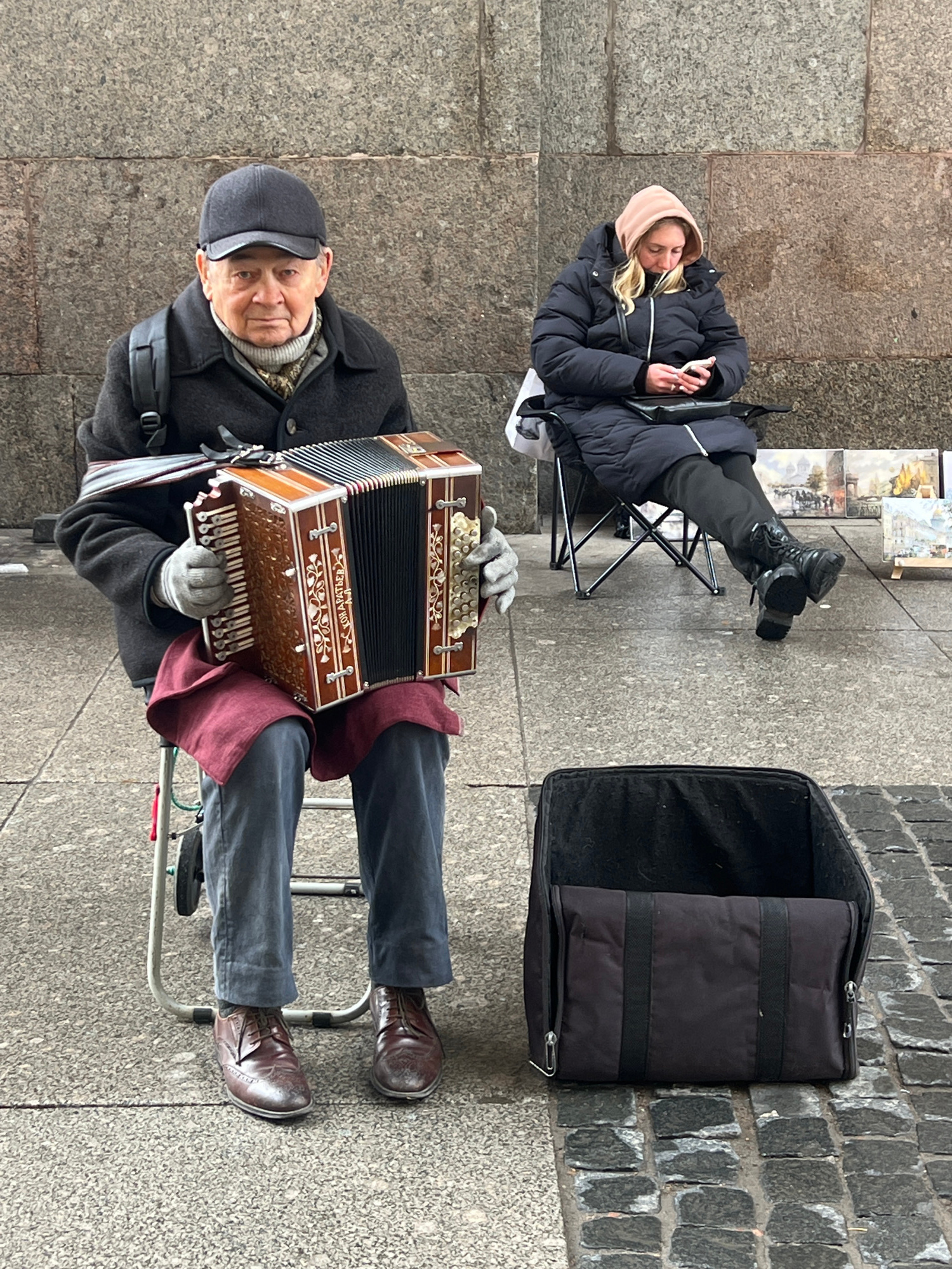 The image shows a man playing an accordion on a sidewalk in what appears to be St. Petersburg, Russia, based on the architectural style of the buildings depicted in the paintings in the background. Th…read more