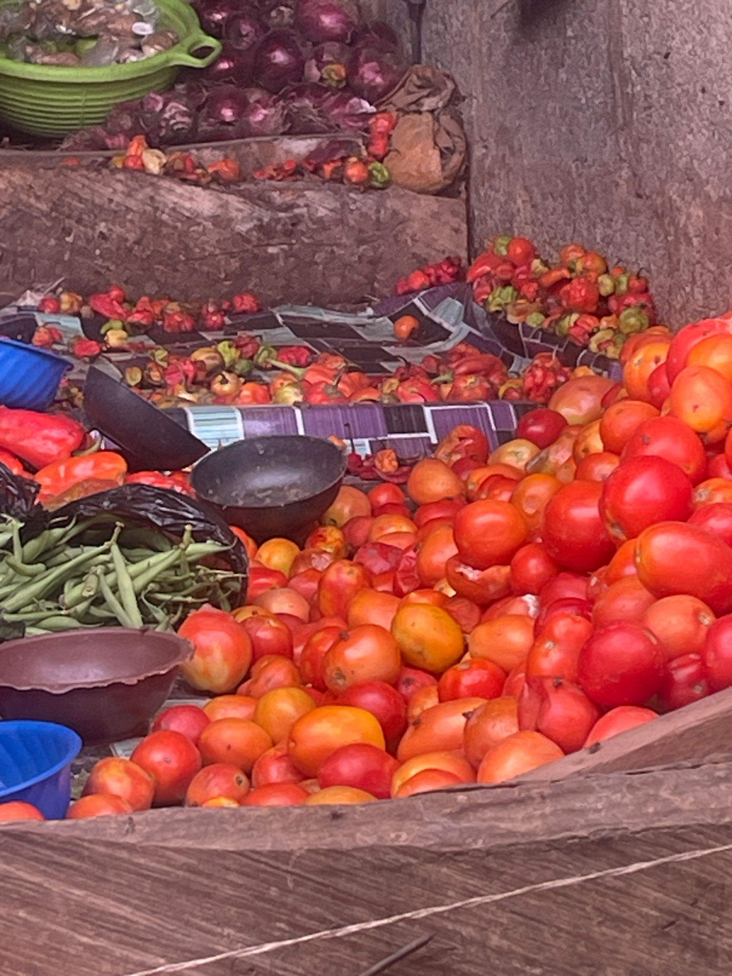 The image depicts a vendor's stall in Abuja, Nigeria. There are piles of red tomatoes, onions, peppers, and green beans for sale. Some items are arranged on a checkered fabric. The stall is constructe…read more