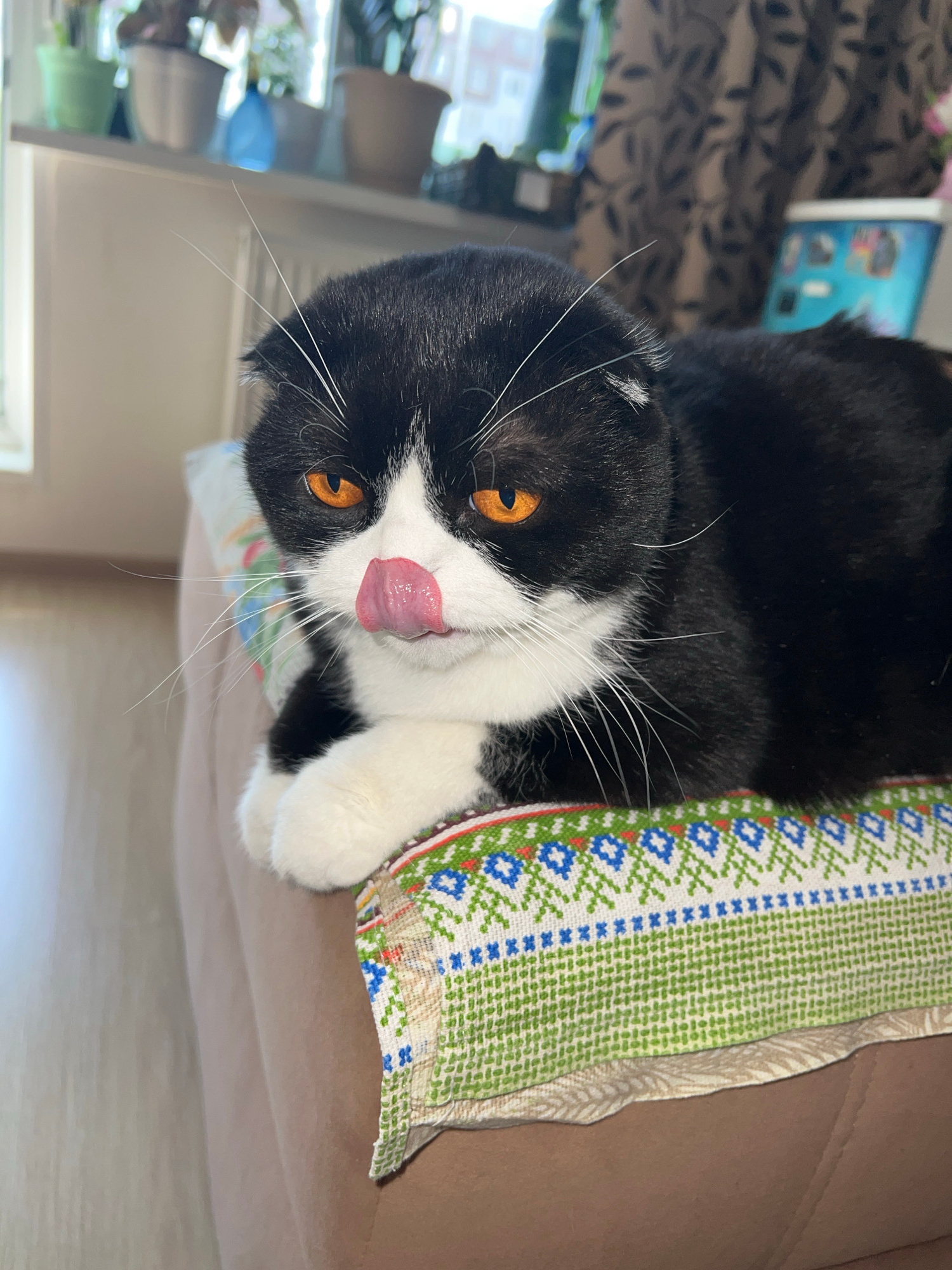 A black and white tuxedo cat, likely a Scottish Fold given its folded ears, is captured in a close-up, horizontal shot. The cat is lying on a brown sofa or armchair, with its head tilted upwards, look…read more
