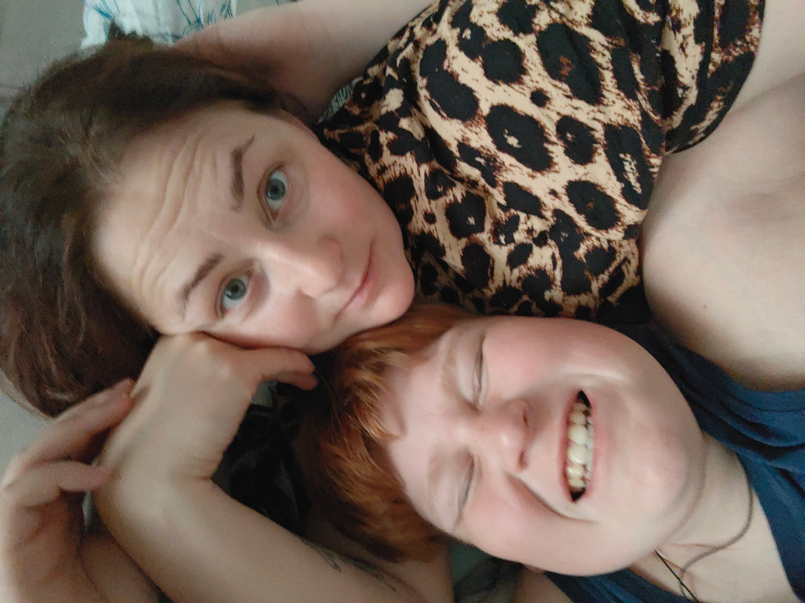 Two women are lying close together. One woman has shoulder-length brown hair and is looking at the camera. She is wearing a leopard print top. The other woman has short red hair and is smiling with he…read more