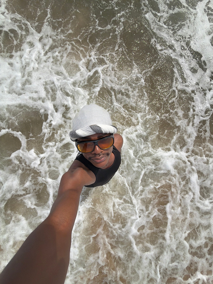 An overhead-angle selfie depicts an adult male partially submerged in agitated water, presumably at a beach in Alaguntan, Nigeria. The individual wears a light grey textured head covering with a black…read more