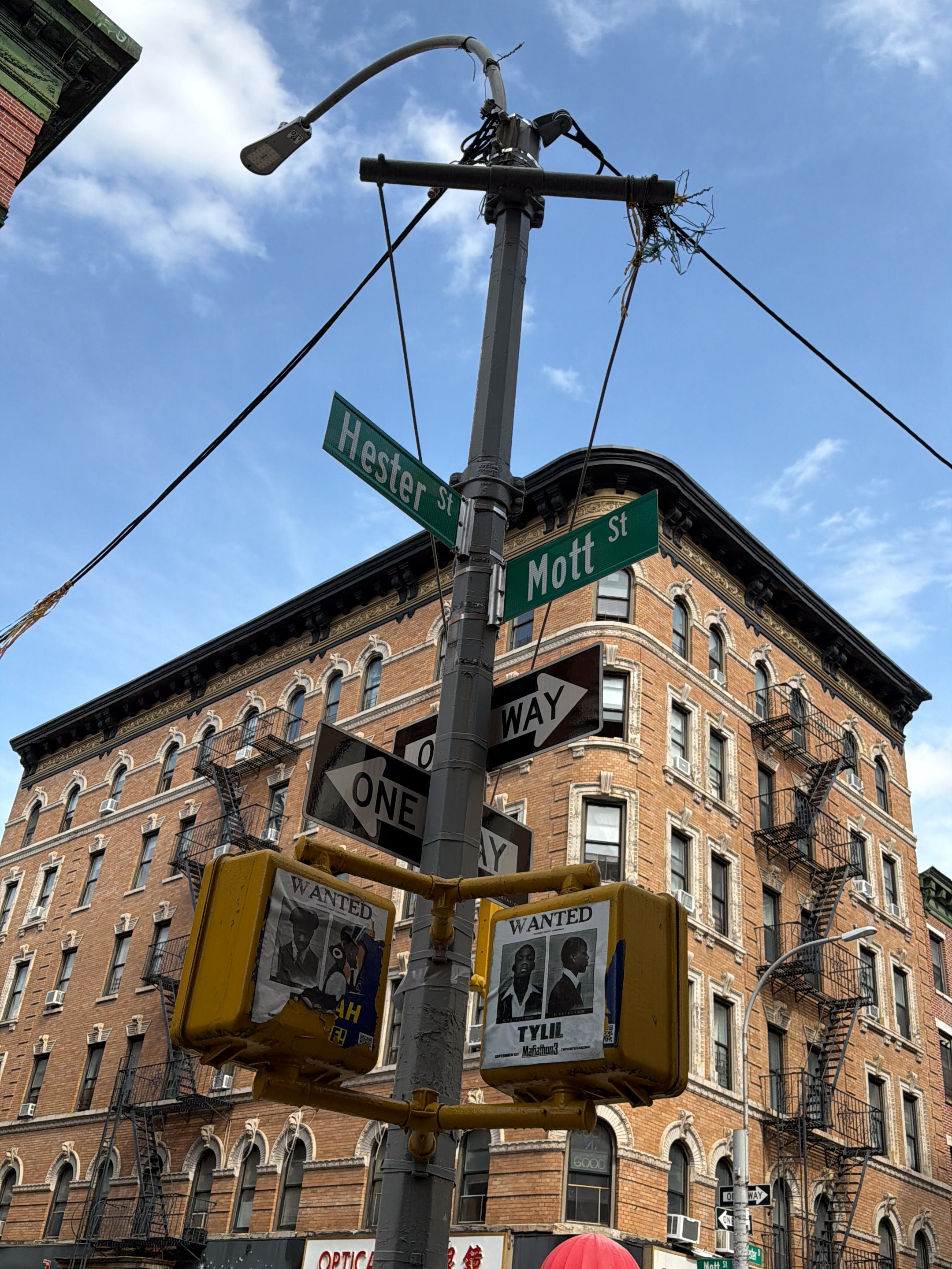 The image depicts a street corner in New York City, United States. The intersection is at Hester Street and Mott Street, as indicated by the street signs. A utility pole stands at the corner, adorned…read more