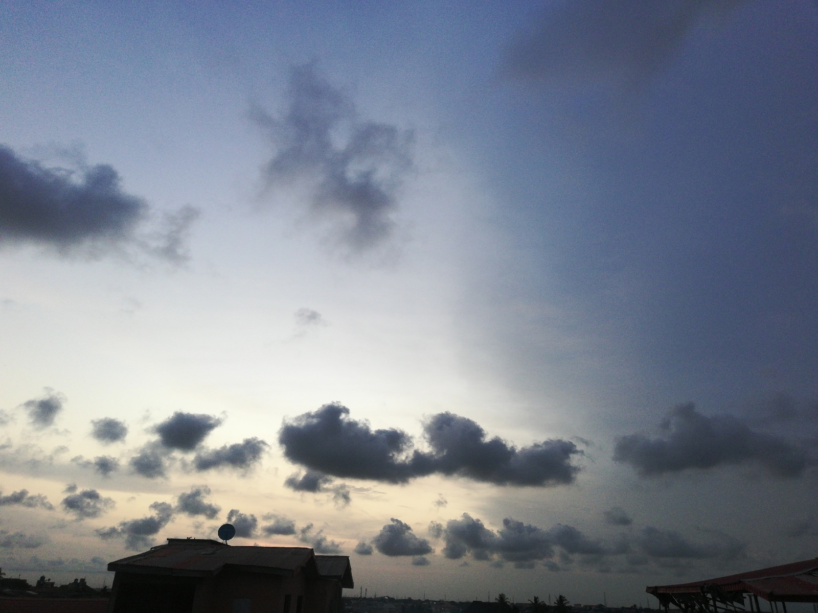 The image depicts a twilight scene in Lagos, Nigeria. A low-angle shot frames a cloudy sky dominating the view, transitioning from lighter hues near the horizon to darker shades higher up. Below the h…read more
