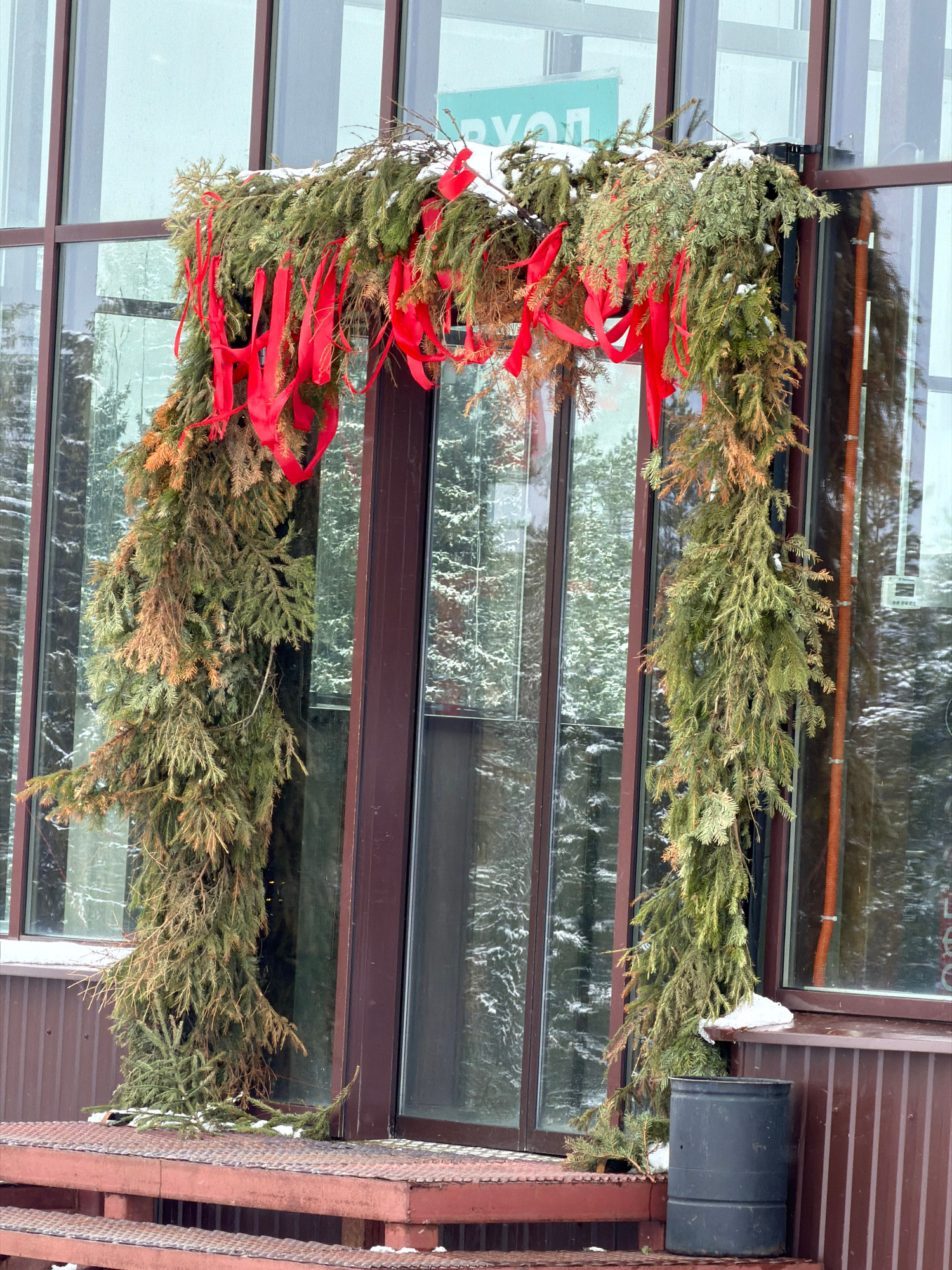 The image depicts a Christmas decoration on a building in what is likely Нечкино, Russia. The decoration consists of evergreen branches, possibly fir or spruce, adorned with red ribbons, arranged in a…read more