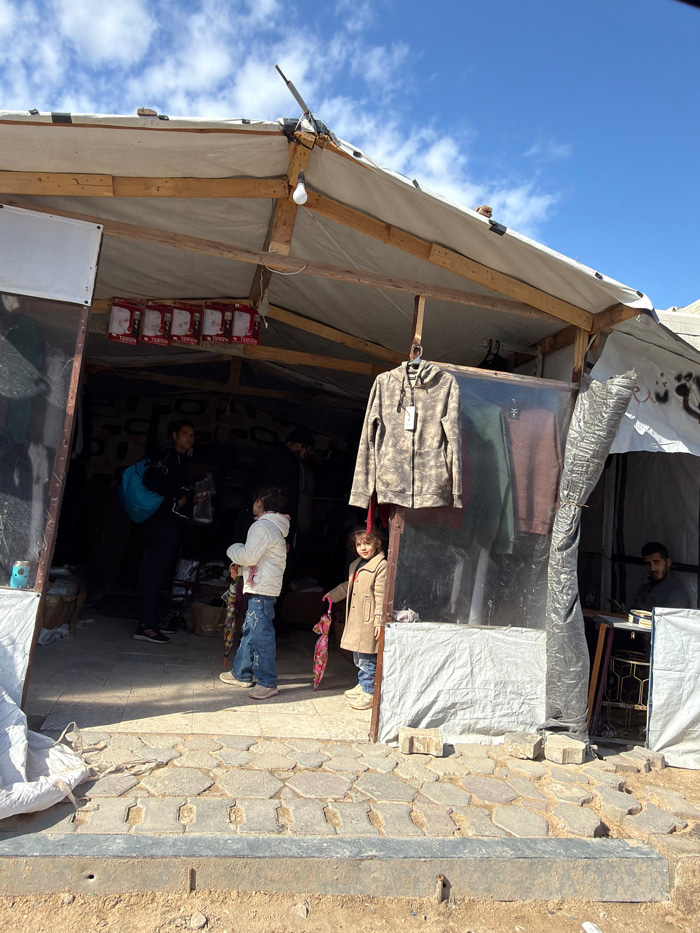 A makeshift store stands beneath a blue sky with scattered clouds. The structure has a tent-like appearance with a wooden frame and canvas covering. Clothing items hang, including a jacket. Inside, th…read more