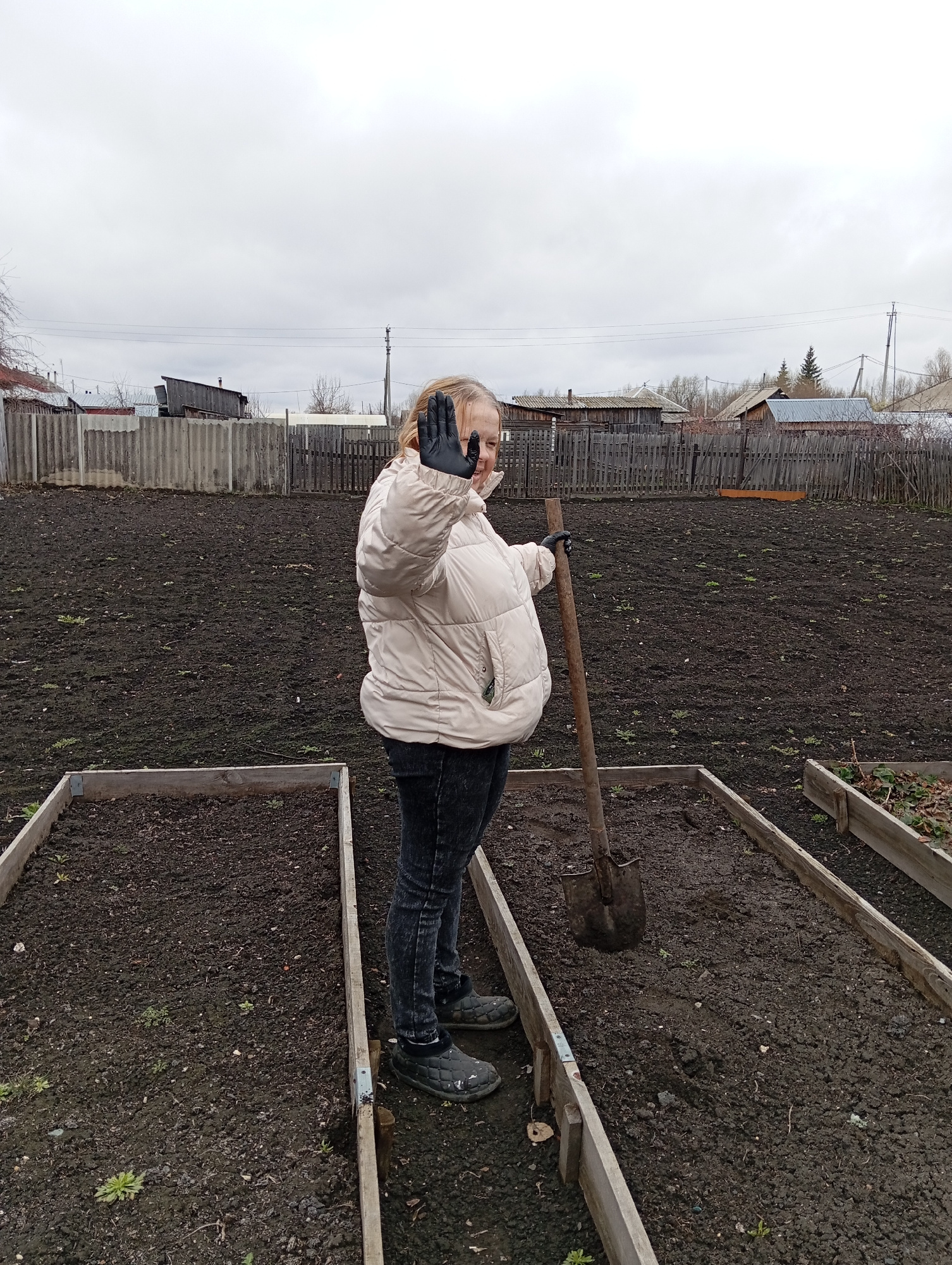 The image shows a woman standing in a garden in Yurgamysh, Russia. She is wearing a light-colored puffer jacket, dark jeans, black gloves, and dark shoes. She is holding a shovel with both hands. The…read more