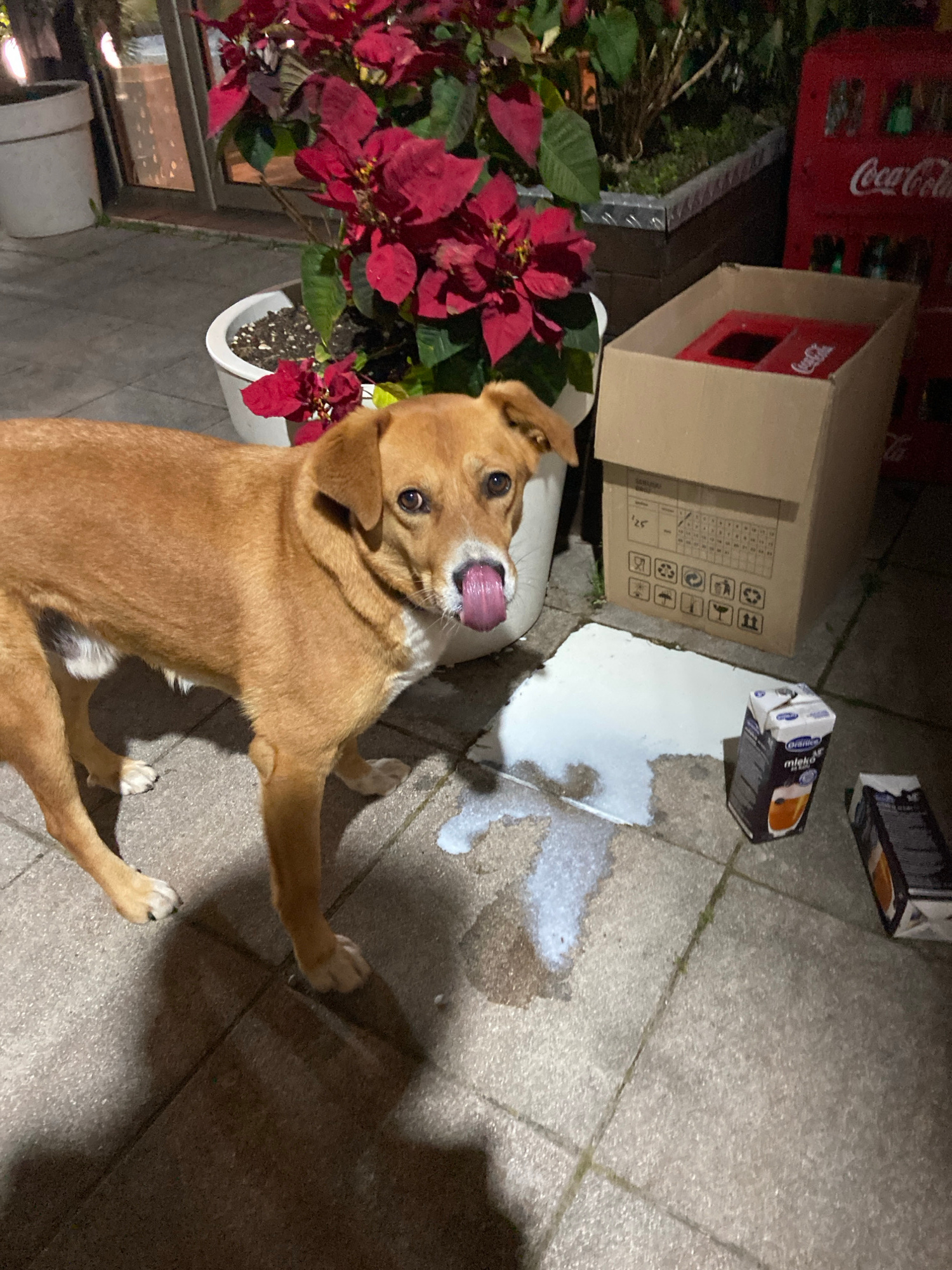 The image depicts a domestic dog, likely a mixed breed with tan fur, standing near a spilled carton of milk on a paved surface. The dog's tongue is extended, possibly licking the milk. Behind the dog…read more